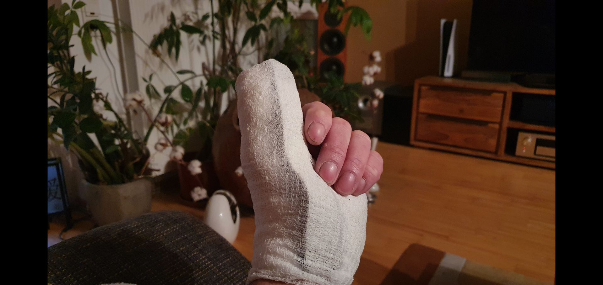 Kann halt nur nix vernünftig machen und hatte neben geschwollenem Daumen auch einen Mega-Bluterguss unter dem Fingernagel, der durch den Nagel aufgebohrt werden musste.