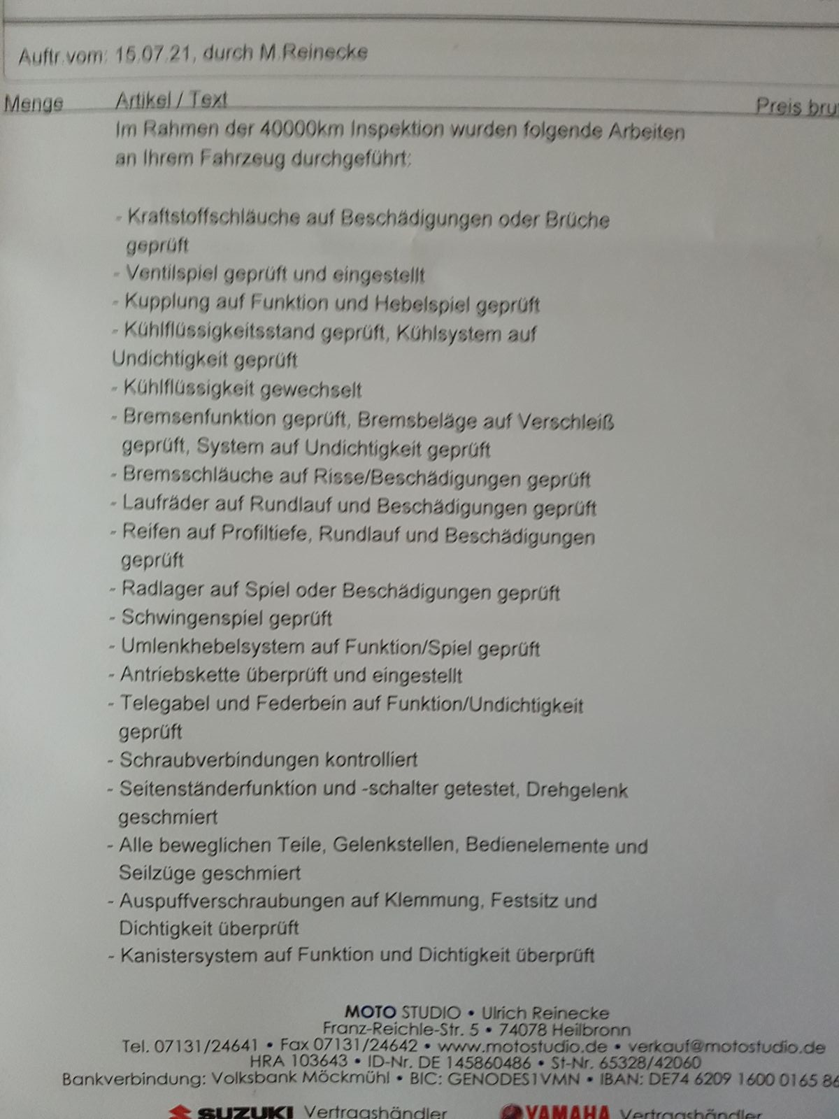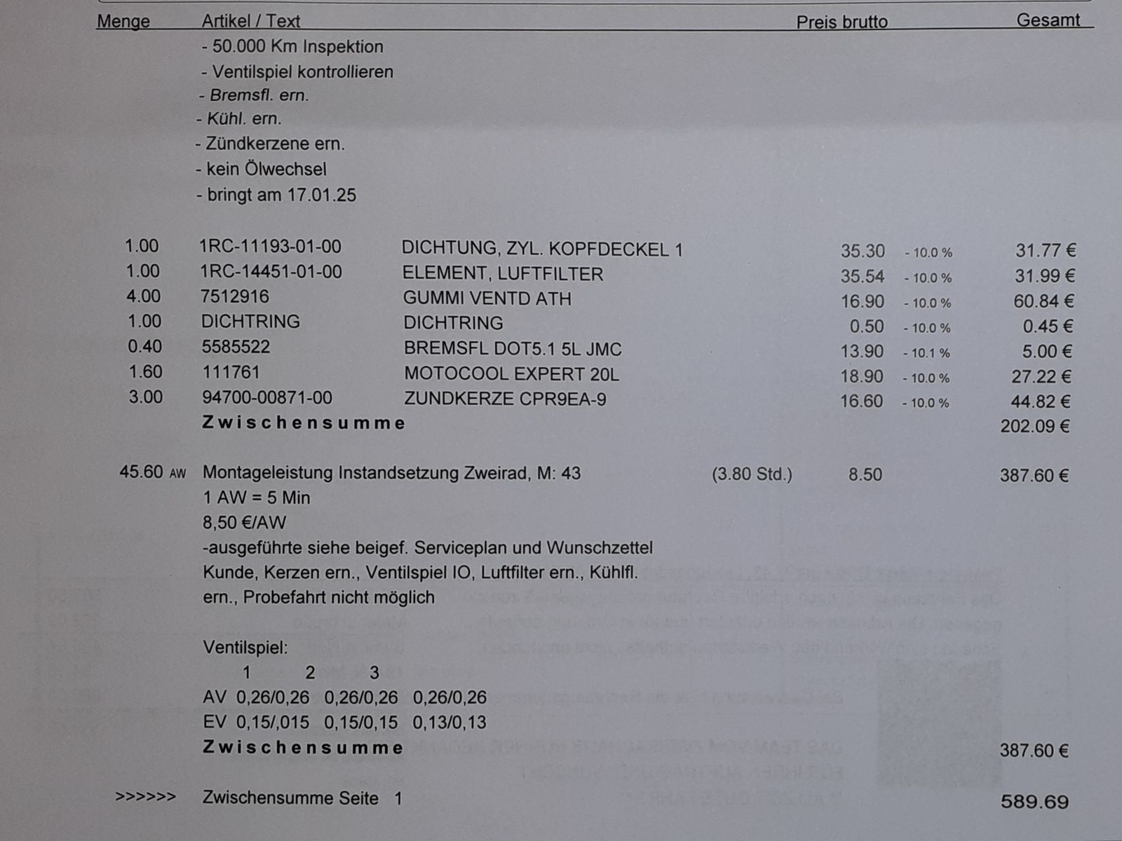 Ölwechsel mit Filter, Luftfilter und Zündkerzen hatte ich vorher selber gemacht. Auch Bremsflüssigkeit hab ich selbst gewechselt. Es sollte also nicht so sehr ins Geld gehen.