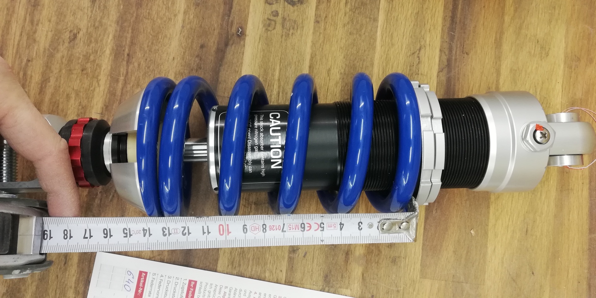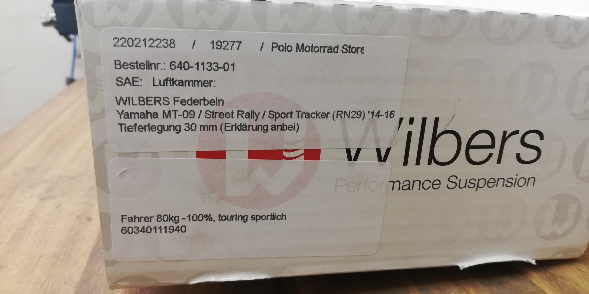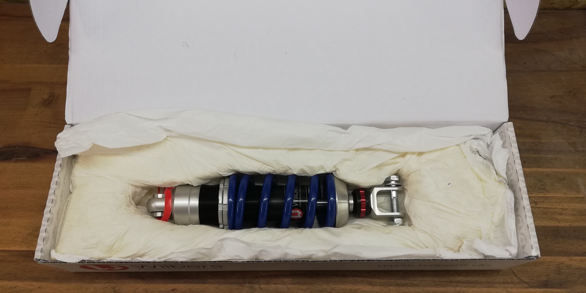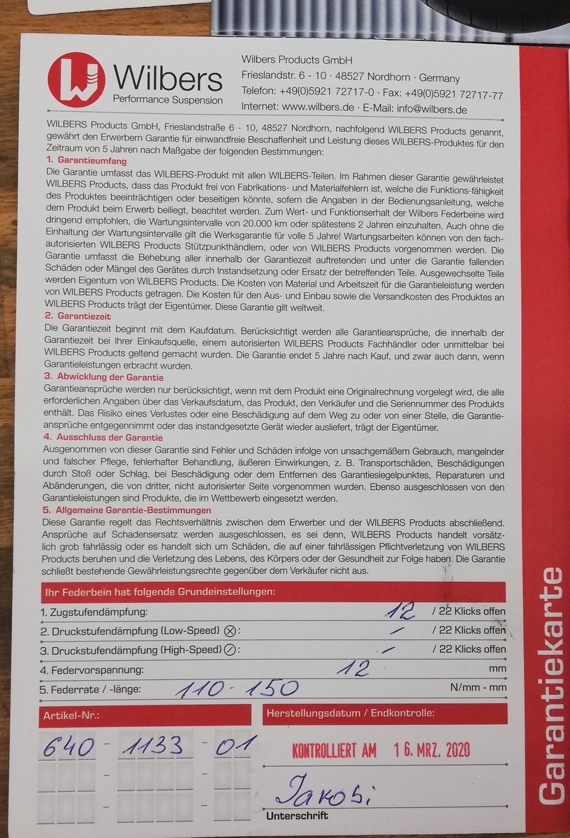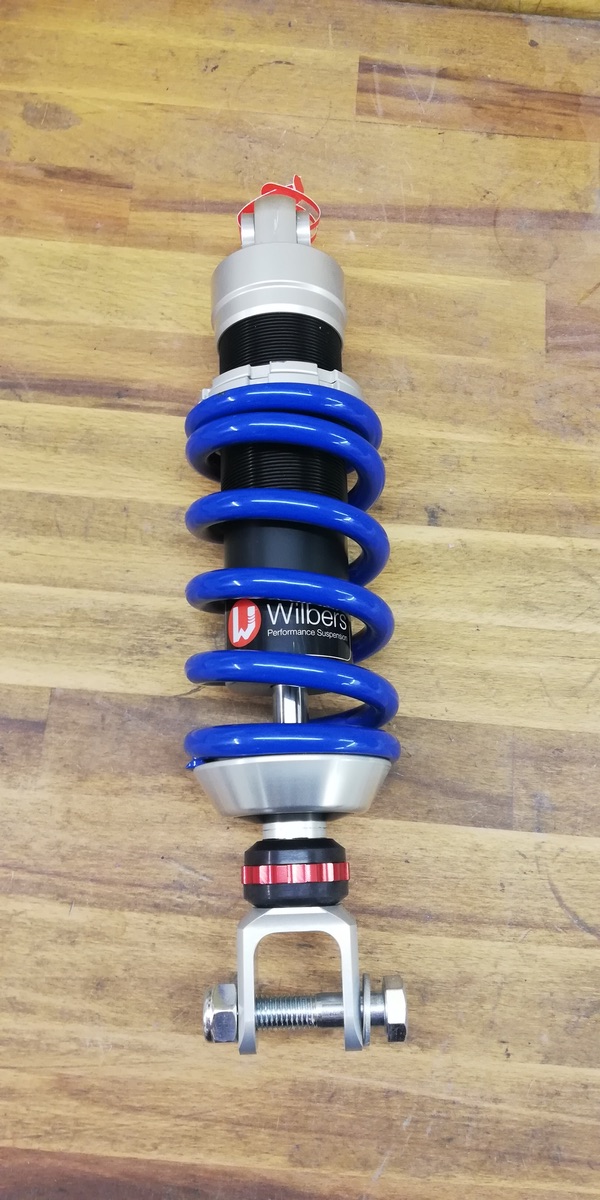 Neues Wilbers Federbein Modell 640 in der Blueline Ausführung mit 30mm Tieferlegung für Fahrer/innen mit 80kg fahrfertiges Gewicht.