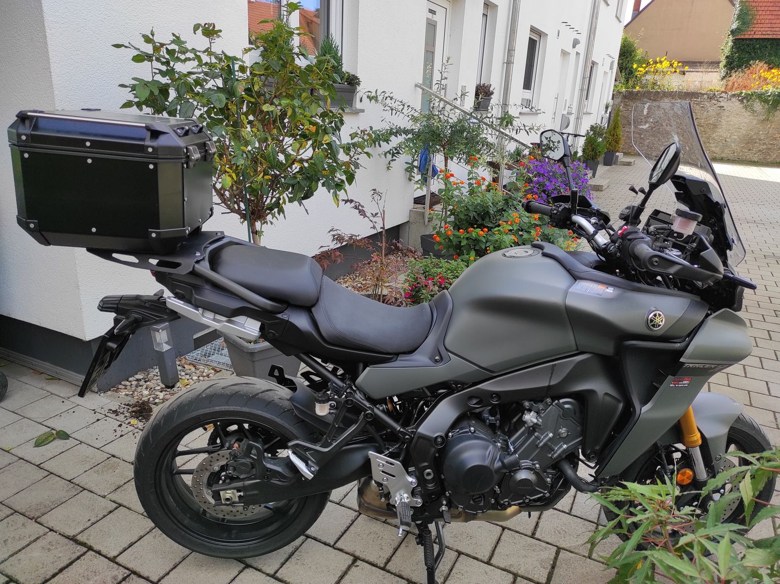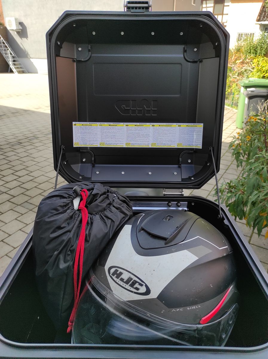 Das Case ist ein Givi Trekker Outback 42l, da passt mein Helm sowie die Regenkombi rein. Wem das nicht reicht, es gibt auch noch ein 58l. Mir gefällt das Alu besser als die üblichen Plastikbomber. Die Seitenkoffer der GT bleiben im Keller und werden nur für Urlaubsfahren rausgeholt. Der XL-Helm passt mit Kommunikationssystem an der Seite nur mit Mühe in die Koffer rein, zudem bin ich mir sicher dass ich mit den Koffern früher oder später irgendwo hängen bleiben würde.