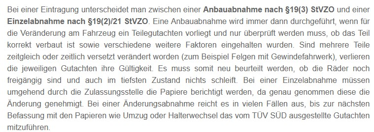 Aber es handelt sich bei den Risern im eine Anbaumaßnahme, da ein Teilegutachten vorliegt. Somit ist eine Einzelabnahme NICHT notwendig.