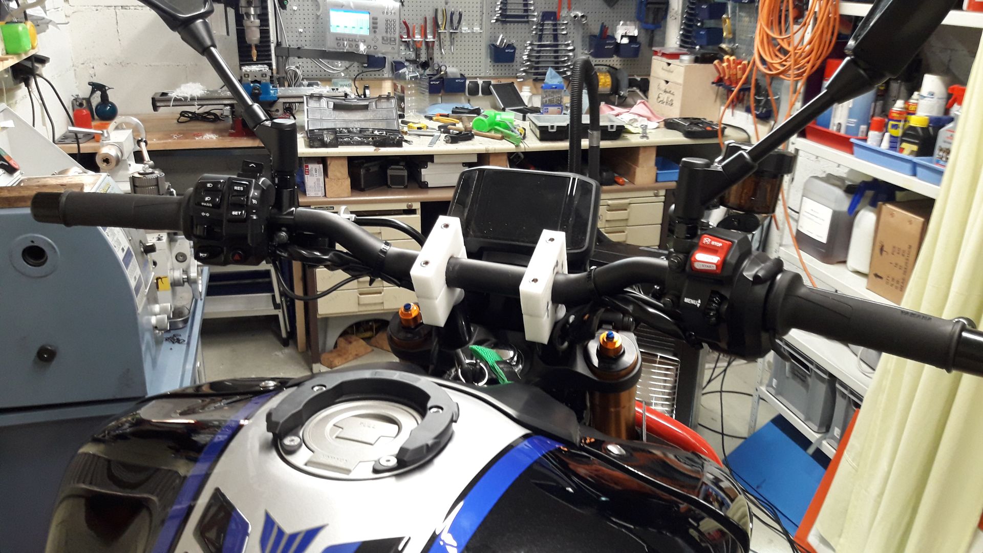 #556 Alles anzeigenDie aufrechte Sitzposition hat mir gar nicht gefallen. Daher habe ich mir überlegt andere Klemmblöcke zu montieren. Wie aber herausfinden, wieviel kürzer dürfen diese sein, um nicht mit den Armaturen am Tank zu stoßen. Ich habe mir dann auf der Drehbank und der Fräse Kunststoffdummy´s gebaut. Die Vario Riser von ABM sind mir sofort ins Auge gestochen. Eventuell hätte ich mir noch Distanzen aus Alu gedreht und die Originale ersetzt. Siehe da, sie passen so wie sie sind. Ich habe sie verkehrt montiert und so den Lenker noch weiter nach vorne gebracht und ausreichend Abstand zum Tank ist auch geblieben. Probegefahren bin ich noch nicht, darum wird das Finale Setup erst danach stattfinden.