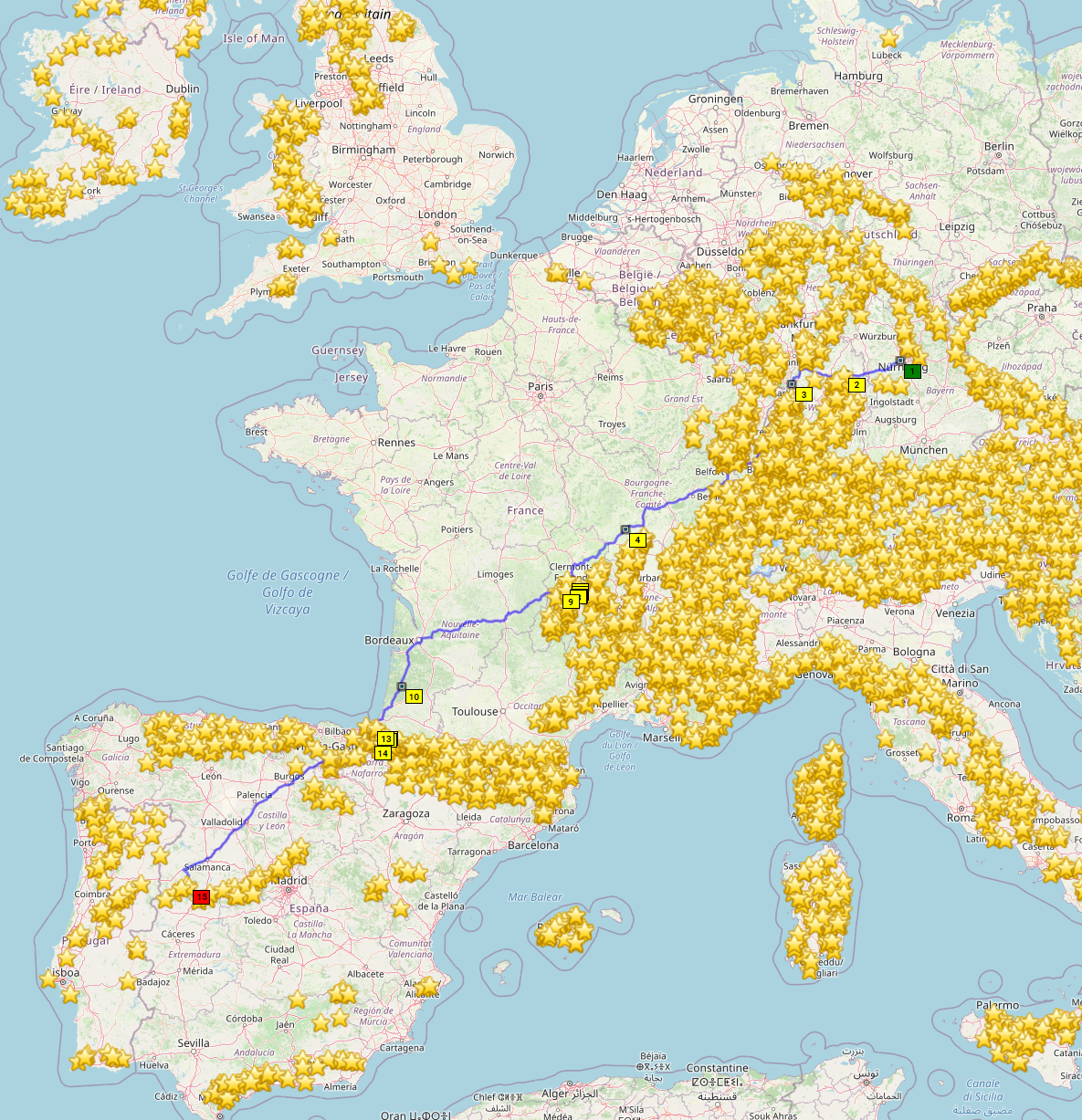 Der Hinweg erfolgt weitgehend direkt, für den Rückweg habe ich mir aber schöne Strecken rausgesucht. So habe ich noch Zeit und hoffentlich auch Reifenprofil übrig, wenn ich mit Portugal fertig bin, denn Portugal ist die Priorität. Für die Rundfahrt habe ich 7 Tage zu 400 km geplant, also eher entspannt.
