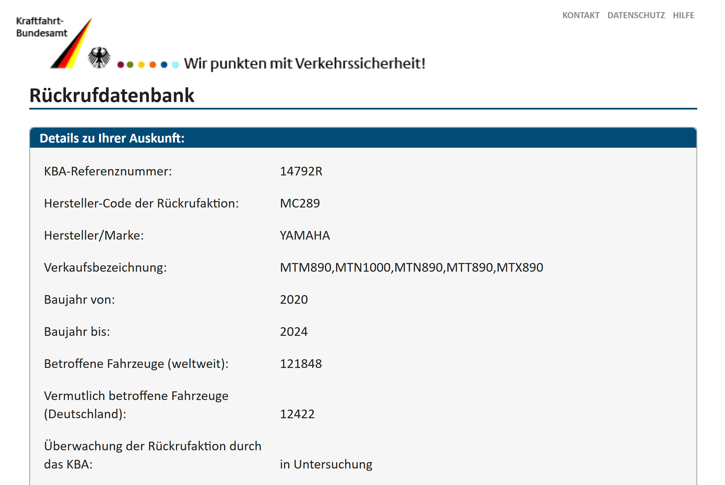 Nach einer kurzen Recherche bin ich zum Schluss gekommen dass die RN87 SP Modelle wohl nicht betroffen sind denn deren FIN enthält im ersten Teil anstatt des "J", eine "9"! Wenn man sich ältere Rückrufaktionen anschaut bei denen die SP betroffen war, wurde auch immer RN879 angegeben und nicht RN87J! Außerdem ist die Bezeichnung der MT-09 SP nicht MTN890, sondern MTN890D und diese fehlt in der Deutschen Rückrufdatenbank. Also für mich heisst das erstmal Entwarnung.