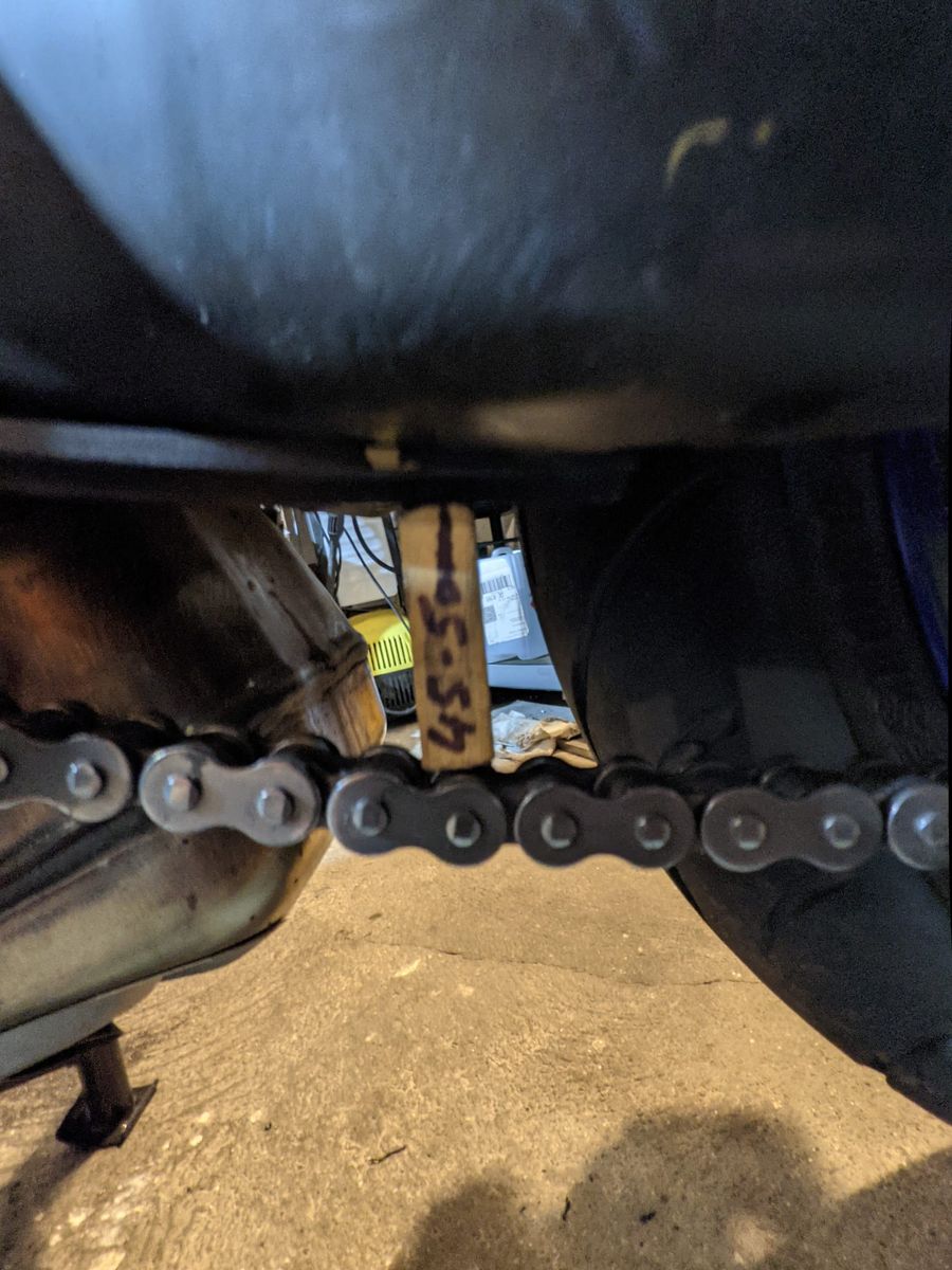 Damit kann man entspannt die Kettenspannung prüfen und beim Einstellen merkt man sofort, wenn der Durchhang kleiner wird.