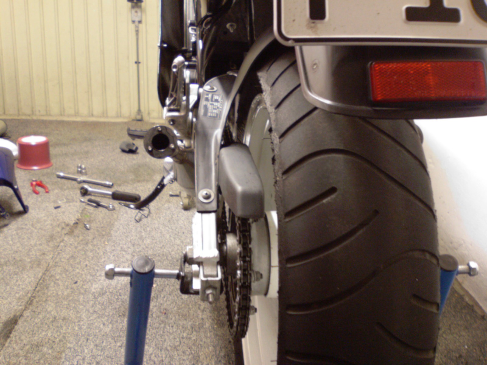 Hab die Ursache für das Geeier leider erst danach festgestellt. Erschwerend kam hinzu, dass das Motorrad auch noch ein sehr leichtes ist, welches sowieso weniger Druck braucht (noch ein Foto für die Freaks anbei