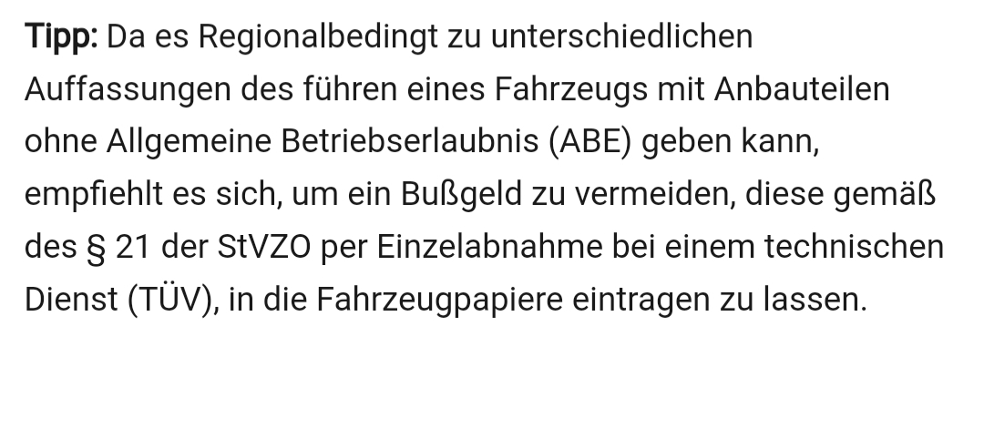 Naja, ich will das Thema nicht schönreden, aber wieviel Bauteile ohne ABE würde eine Firma anbieten, wenn es nicht Menschen gäbe denen es egal ist und die das trotzdem kaufen?
