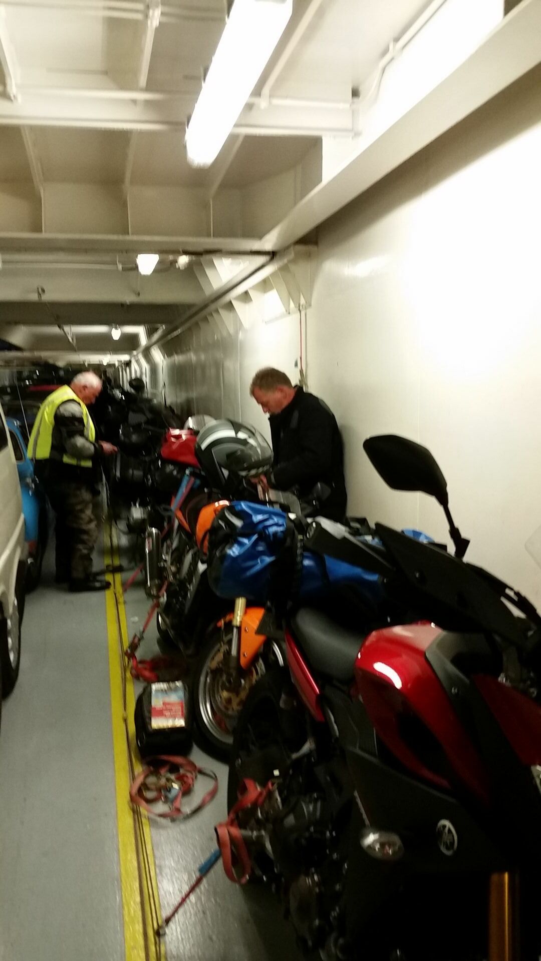 ... wie man ein Bike auf der Fähre verzurrt, damit es bei Seegang nicht koppheister geht.
