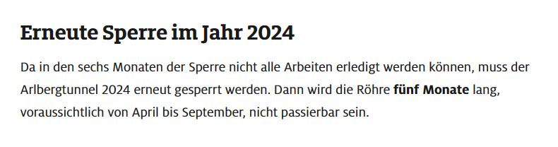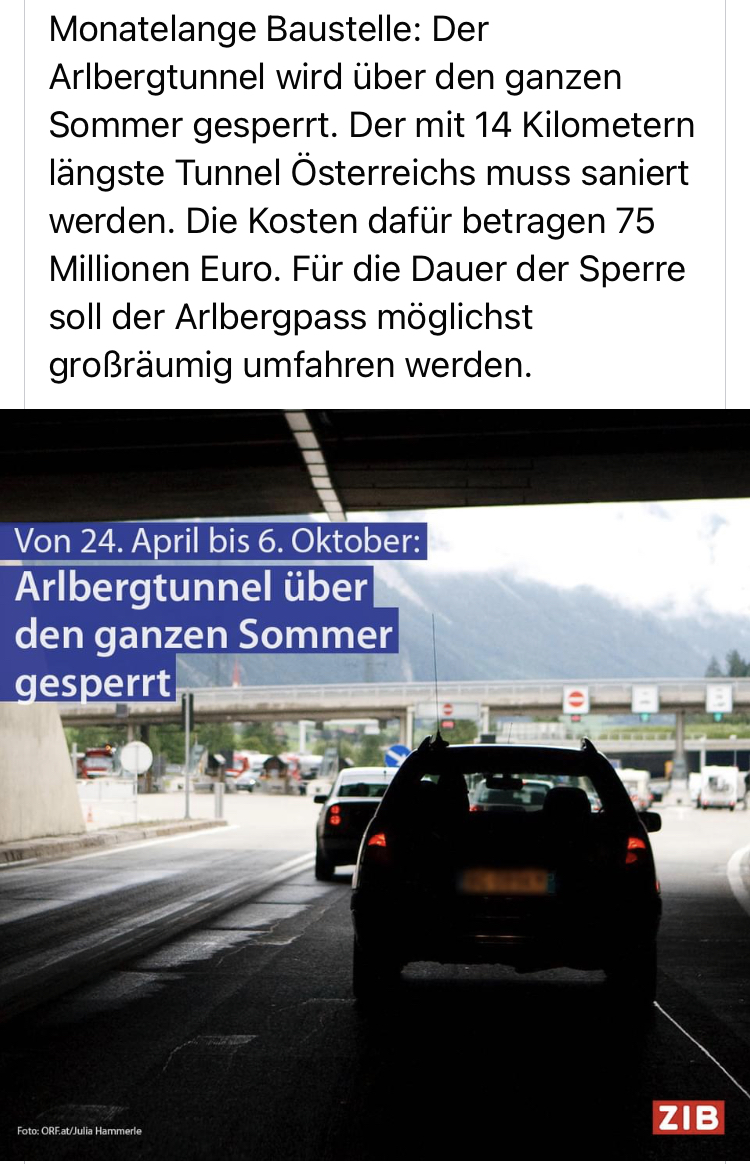 Arlbergtunnel 24.4. - 6.10. gesperrt