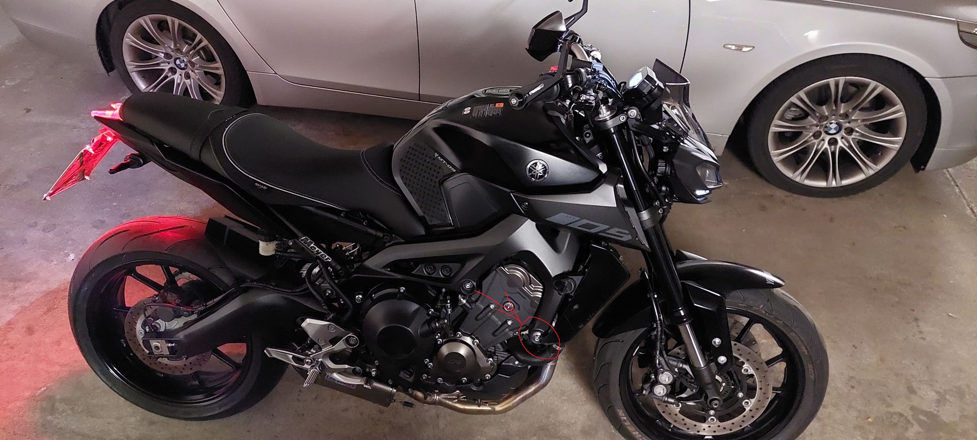 Eigentlich simpel: Du musst die vordere von Dir markierte Schraube, die den Motor hält, rausdrehen und den Sturzpad mit der (hoffentlich) beiliegenden längeren Schraube dort dann festschrauben.