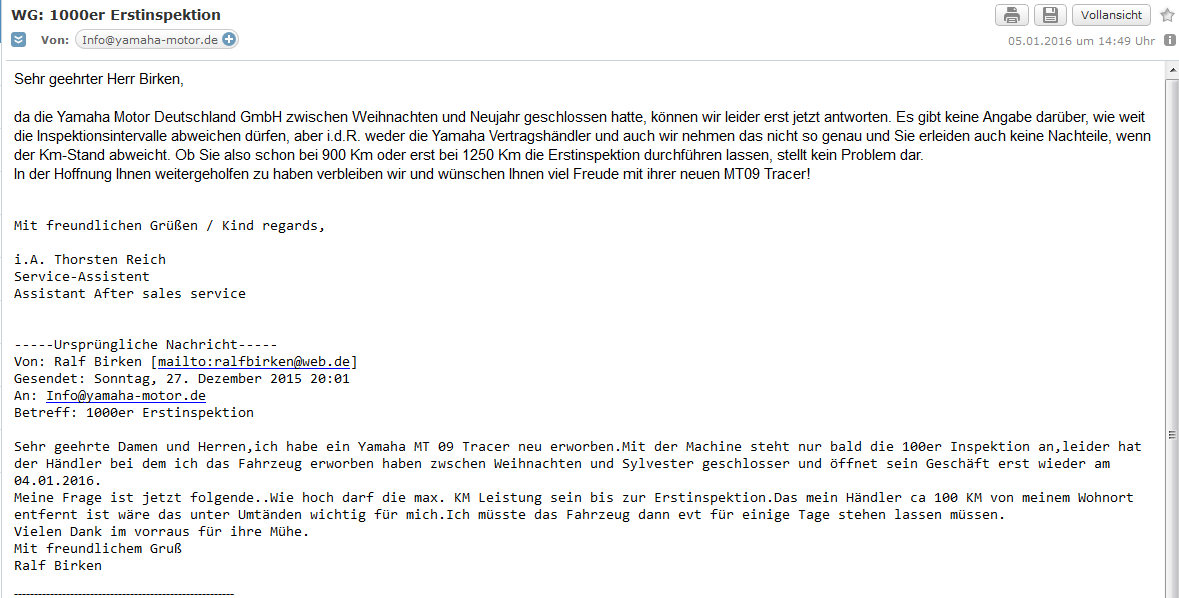 Momentan hat die Maschine 5000km auf der Uhr. Laut meinem Händler mache ich im März nur eine Jahresinspetkion und kann die Garantie um ein weiteres Jahr verlängern.