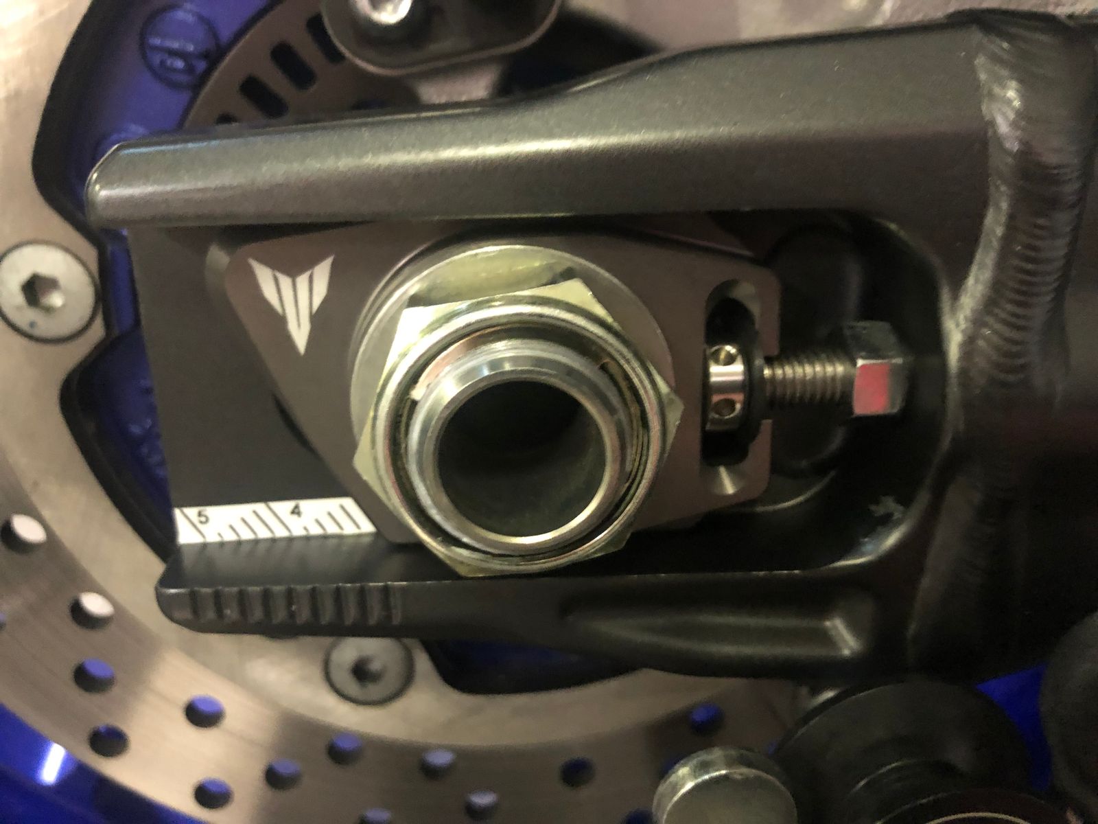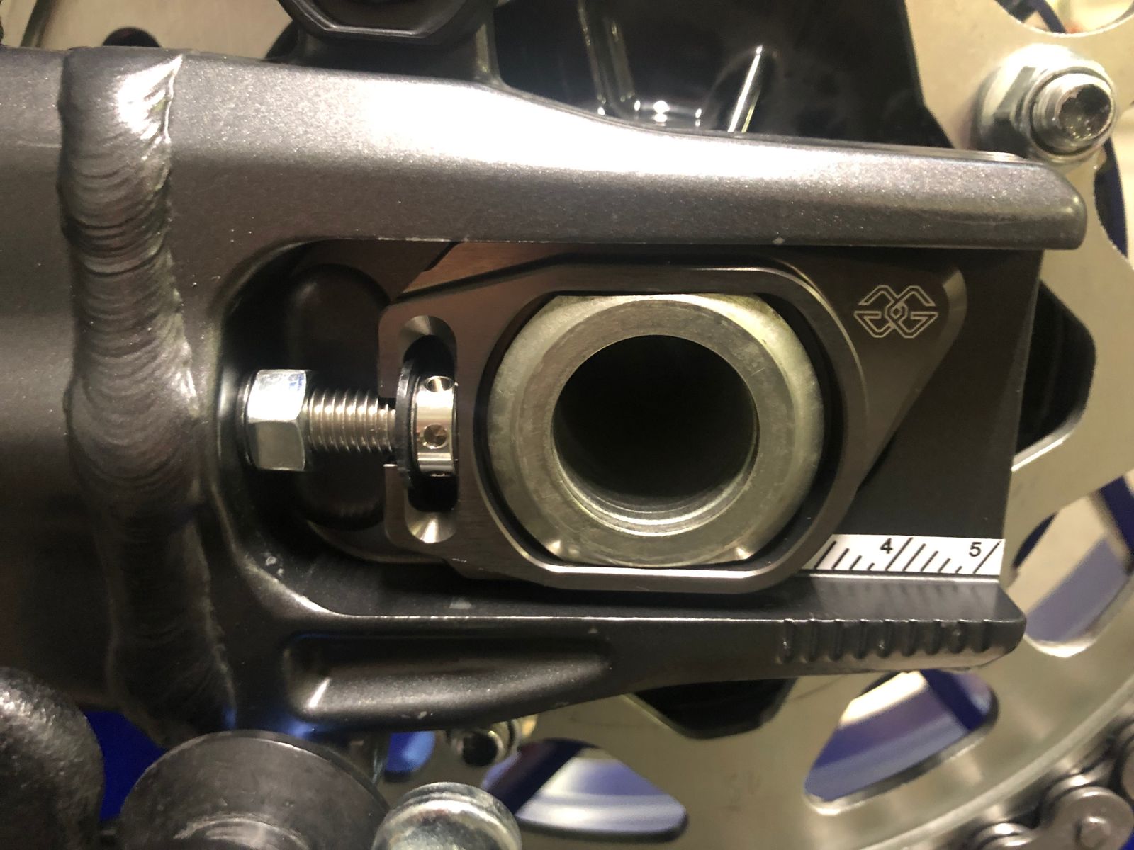 Ich benutze zur "Endkontrolle" auch den magnetischen Laser. Die Markierungen auf der Schwinge sind eher grob. Bei mir 0,5 mm Unterschied links/rechts. Habe auf GILLES Kettenspanner umgerüstet. Erleichtert die Einstellung der Kettenspannung deutlich.