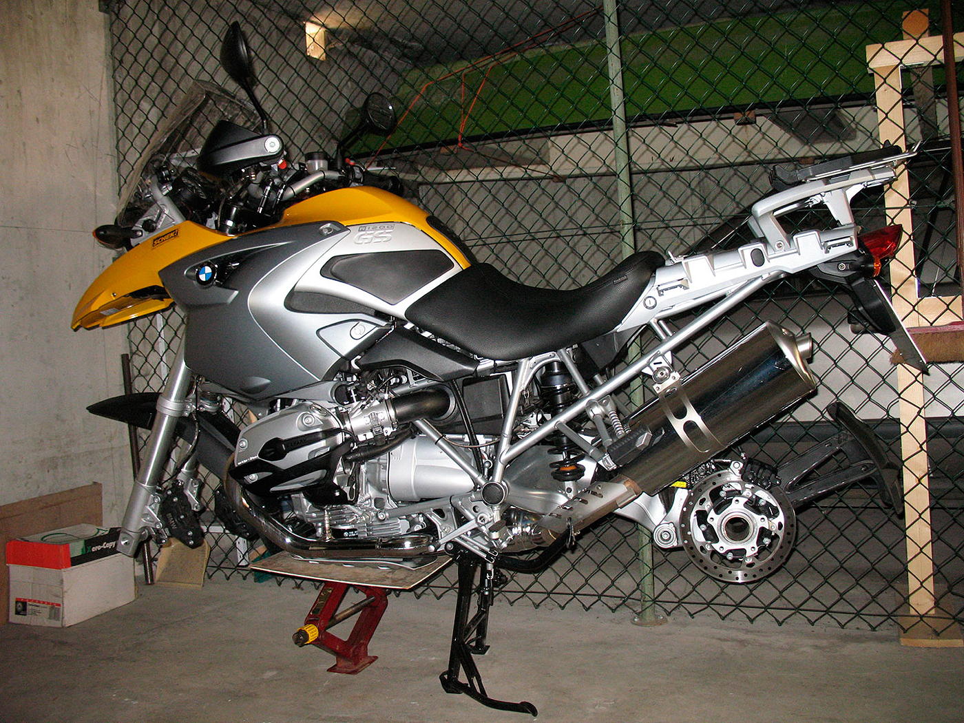 Hier zeige ich das Beispiel an einer BMW. Unter den Motor (klar, die GS hat da einen Motorschutz) kommt ein Scherenwagenheber mit einem Brett o.ä. unterlegt. Durch den Scherenwagenheber ist es möglich für die Vorderachse die Höhe so auszutarieren, dass sie bequem herausgezogen werden kann. Wenn zuerst das Hinterrad demontiert wird, geht es dort evtl. genauso.