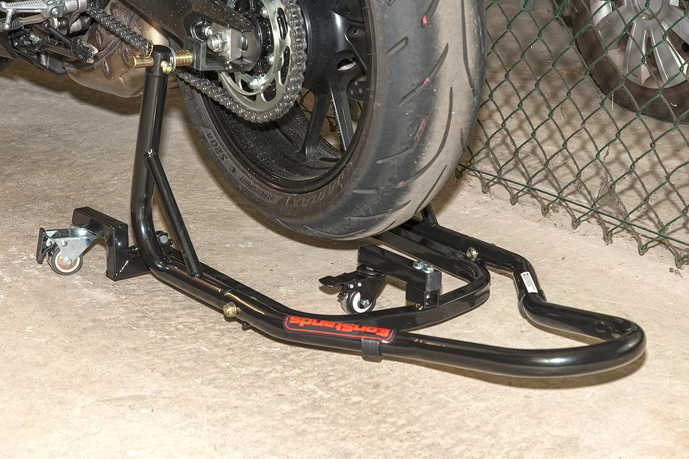 Dazu schaffte ich mit von Constands den "Mover" an. Eigentlich ein normaler Heber, aber mit einem Untergestell mit 3 Rollen. Damit ist das Motorrad komplette rollbar, auch quer z.B. vor eine Wand und es steht senkrecht. Für vorn hab ich ebenfalls einen Lifter. Ich finde, das Motorrad steht sehr sicher. Vor der Rädermontage natürlich ohne Aufbocken erst Mal alle Schraubenverbindungen lösen/lockern. ABS Sensor bei der RN43 nicht vergessen, sonst bleibt die Bremsscheibe daran hängen und er wird evtl. beschädigt. Da nun die Achsen in der Luft hängen, ist der Einbau leider etwas fummelig; besonders hinten. Aber es klappt mit etwas Übung.