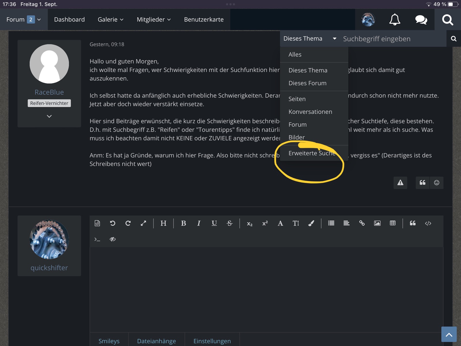 D.h. mit Suchbegriff z.B. "Reifen" oder "Tourentipps" finde ich natürlich etwas. Finde aber wohl weit mehr als ich suche. Was muss ich beachten damit nicht KEINE oder ZUVIELE angezeigt werden.
