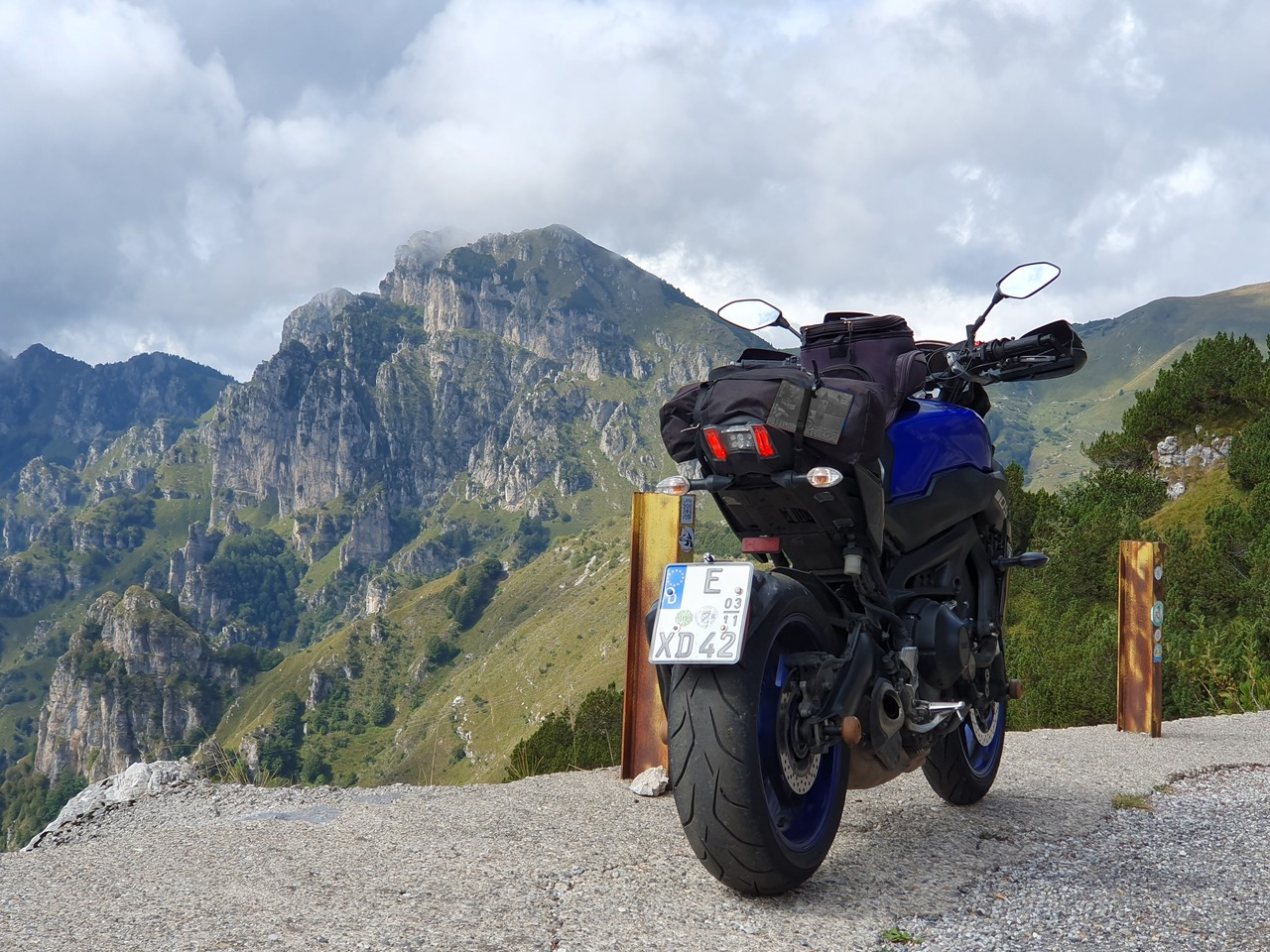 Es war aber zum Glück nicht nur schlechtes Wetter. Im Trockenen hatte ich einfach so einen Riesenhaufen Grip, den zu nutzen ich mich kaum getraut habe. Die MT-09 hat agil eingelenkt. Schräglage und die Kurvenradien ließen sich einwandfrei mit Gas, Bremse und Lenkung einstellen. Kein auffälliges Aufstellmoment beim Bremsen in Schräglage. Grip Grip Grip auch bei hohem Tempo und Schräglage. Geschmiert hat nichts, es war aber auch nur maximal 25 Grad warm. Ich war auch auf Schotterstrecken und Bröselpisten unterwegs. Da gehört der Reifen natürlich nicht wirklich hin, hatte aber auch dort keinen Nachteil gegenüber einem Tourenreifen.