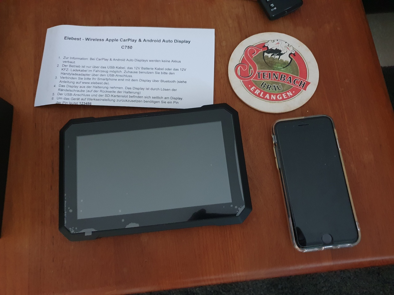 Das hat Vorteile gegenüber dem Smartphone in einer Halterung: Man kann jederzeit andere Dinge mit dem Smartphone tun (Fotos machen), man braucht sich nicht um eine Halterung zu kümmern (schnell über 100 Euro), und das Smartphone geht nicht kaputt. Gegenüber einem zweiten Smartphone ist der Vorteil, dass man sich nicht um die Synchronisation zweier Geräte und über eine zusätzliche Datenverbindung kümmern muss, plus ebenso die Halterung. Eine Lademöglichkeit am Lenker hat gerne Probleme mit Feuchtigkeit oder Überhitzung, mit dem Elebest kann man das Handy im Tankrucksack laden lassen, oder auch nur alle paar Stunden in einer Pause mit einer Powerbank oder gar im Restaurant mit Netzteil. Das Elebest selbst hat keinen Akku. Im Elebest-Karton bekommt man das Gerät selbst, das mit 7 Zoll richtig groß ist, aber leichter als es aussieht. Das Elebest ist 195 mm breit und mit Halterung 138 mm hoch. Hier ein iPhone SE zum Größenvergleich.