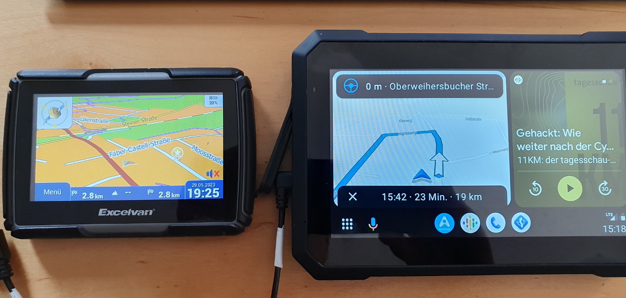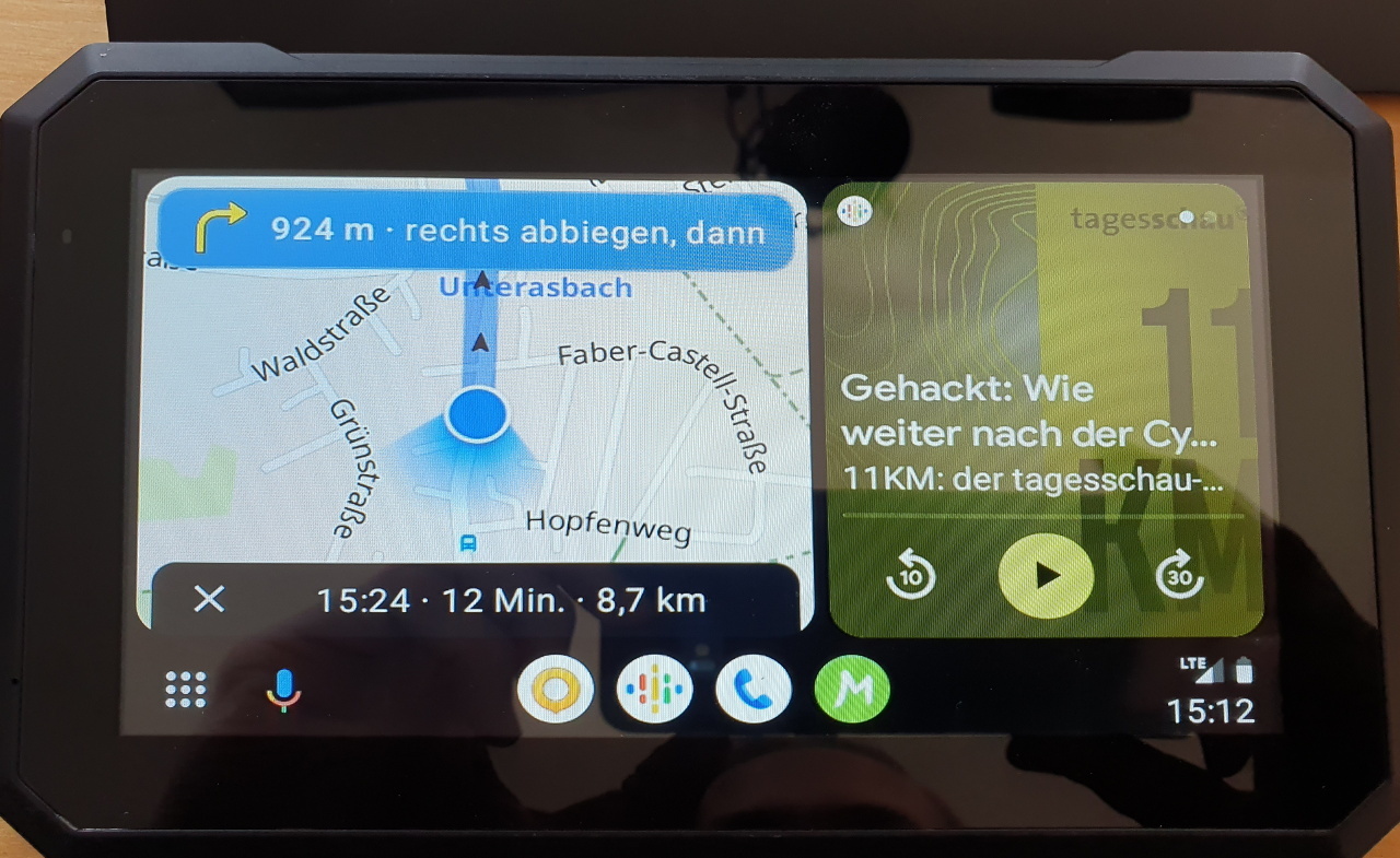 Technisch ist es so gelöst, dass die Geräte sich per Bluetooth gegenseitig miteinander vertraut machen, und dann öffnet das Elebest ein WLAN, in das sich das Handy einbucht. Das heißt auch, dass das Handy dann nicht mehr in einem anderen WLAN sein kann, was unterwegs aber nur in Sonderfällen relevant sein dürfte, z.B. wenn man einen Mobile Hotspot verwendet. Ist das Smartphone gekoppelt, kann man auf dem Elebest die App auswählen, die man starten möchte. Starte man eine Android Auto-taugliche App direkt am Smartphone, öffnet sie sich auch auf dem Elebest. Auf dem Elebest kann man im Splitscreen eine große Navi-App einblenden und 1-2 kleinere Medienplayer, z.B. Podcast und Musik.