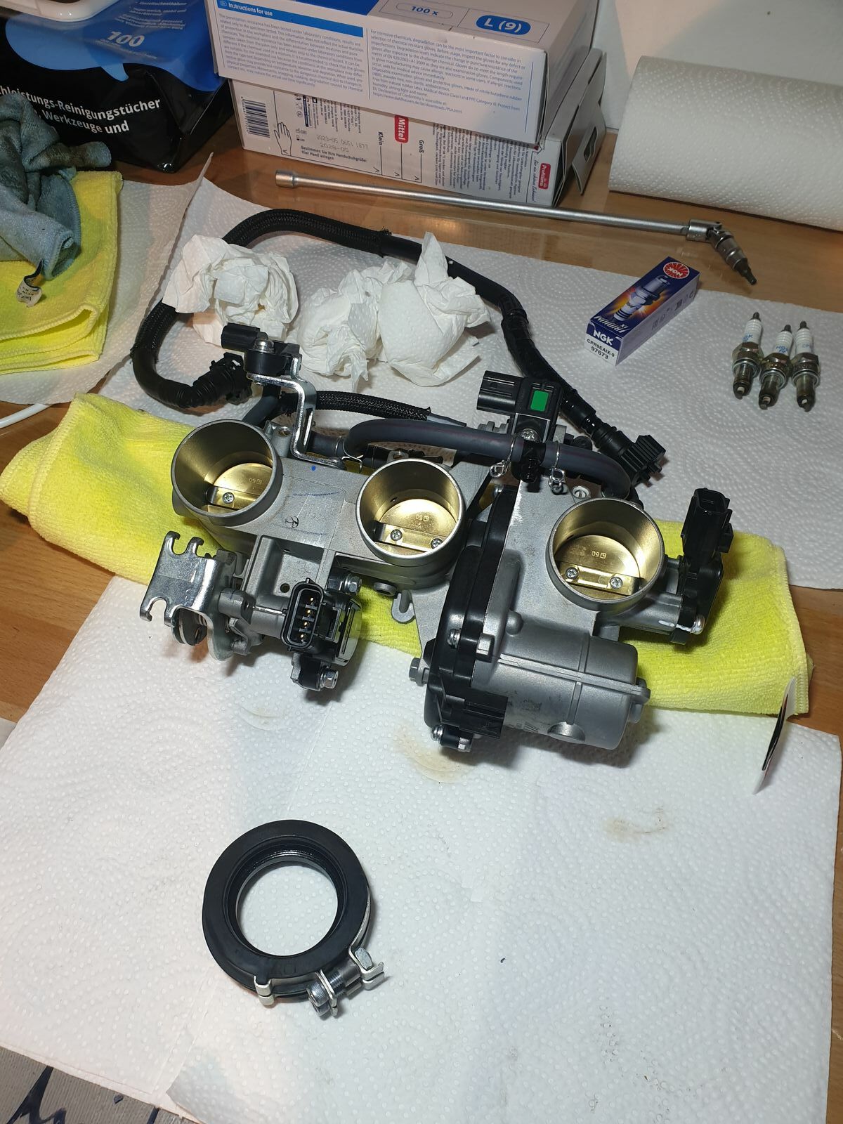 Sekundärluftsystem ausgebaut und gereinigt, Zündkerzen und Luftfilter gewechselt, Ölwechsel, Kettenantrieb grundgereinigt, Drosselkkappengehäuse ausgebaut und gereinigt ... Synchronisieren mit dem Carbtune wollte nicht so recht gelingen, die Stäbchen in den Messröhrchen sind so sehr ausgeschlagen im Betrieb, dass ein vernünftiges Ablesen nicht möglich war. Das und den anderen Mist kann die Werkstatt dann erledigen.