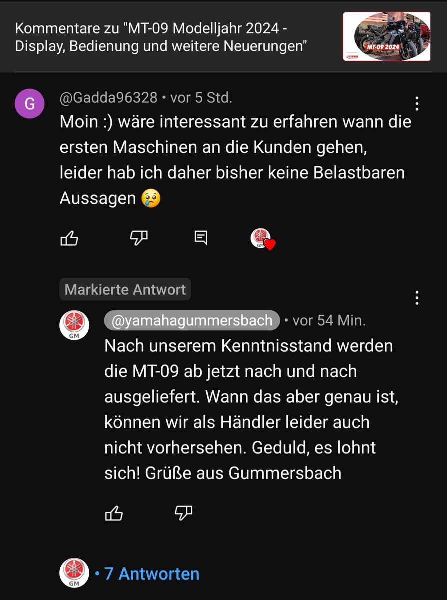 War gerade die neue MT07 für meine Frau in Berlin abholen, da standen schon ein paar MT09 für Kunden rum .. Also über die Schweißerhaube vorne kann man geteilter Meinung sein, aber der ganze Rest, wer naked Bikes mag, wird eher begeistert sein.