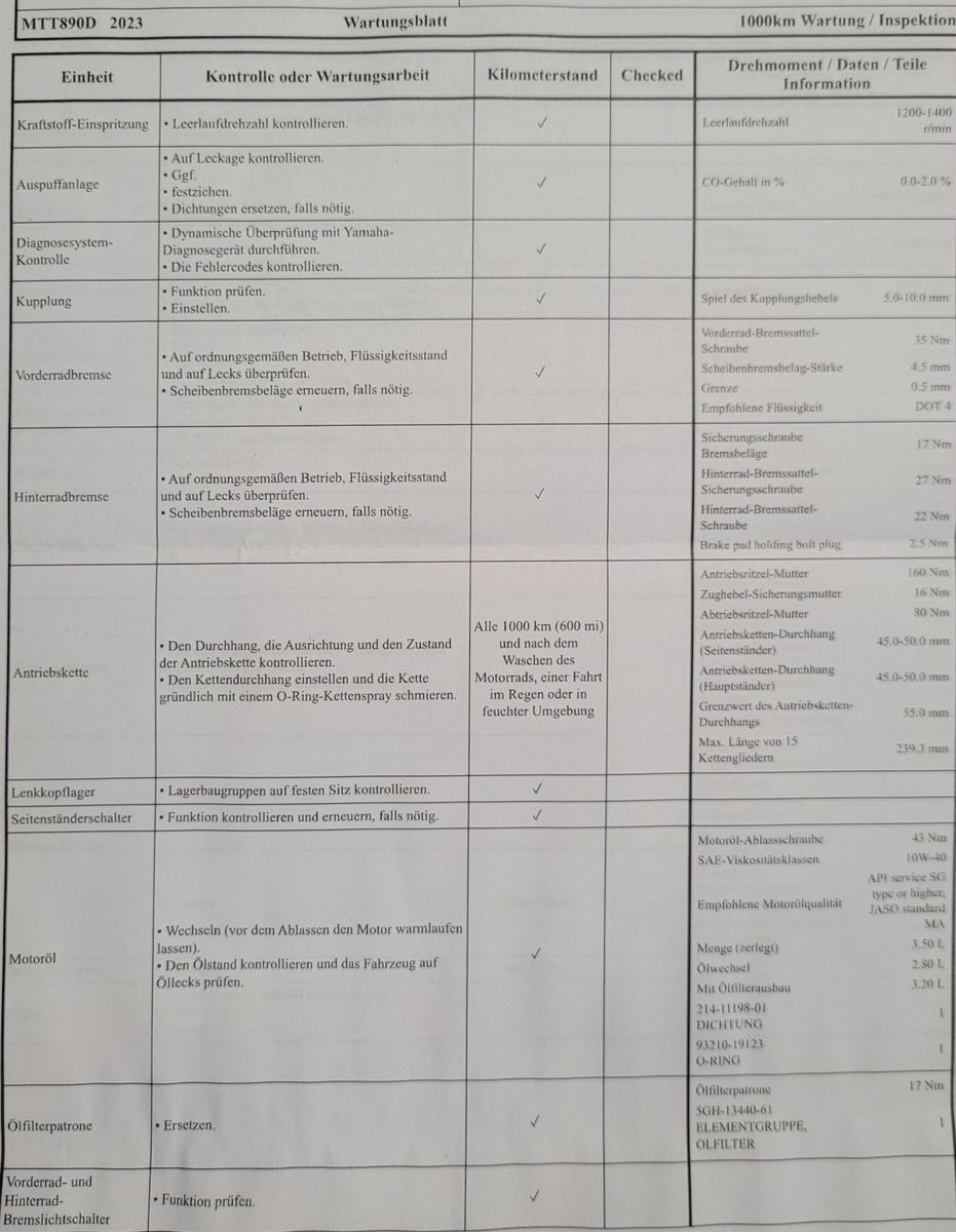 mal eine Frage in die Runde. Ich hatte hier im Forum eine Drehmomentangabe von 105 Nm für die hintere Steckachse meiner Tracer 9 GT gefunden. Laut dem Serviceblatt für die 1000er Wartung soll diese aber mit 160 Nm angezogen werden. Laut dem Freundlichen ist es zwar ein Schreibfehler, weil dort 2x Ritzelmutter steht, aber der erste Wert soll für die Mutter der Steckachse sein. Bin etwas verwirrt, vielleicht kann ja jemand sagen welcher Wert jetzt der Richtige ist.