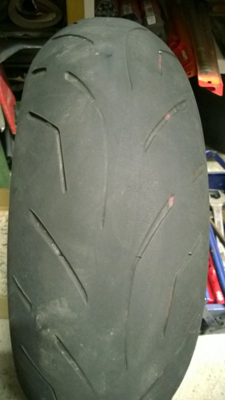 Vorne ist zwar noch was bis zur Verschleißmarke, aber da ich auf Michelin Pilot Road 4 wechsle, kommt er auch mit runter!