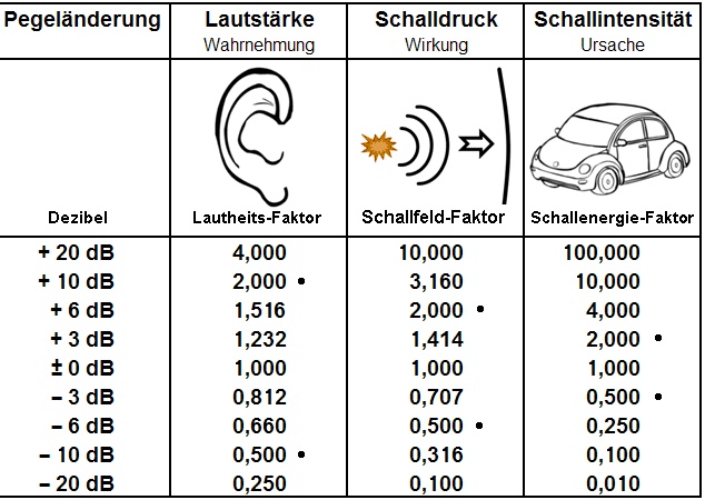 Zur Wahrnehmung („doppelt so laut“) gilt allgemein die Faustregel: ca. +10 dB werden als „doppelt so laut“ empfunden.