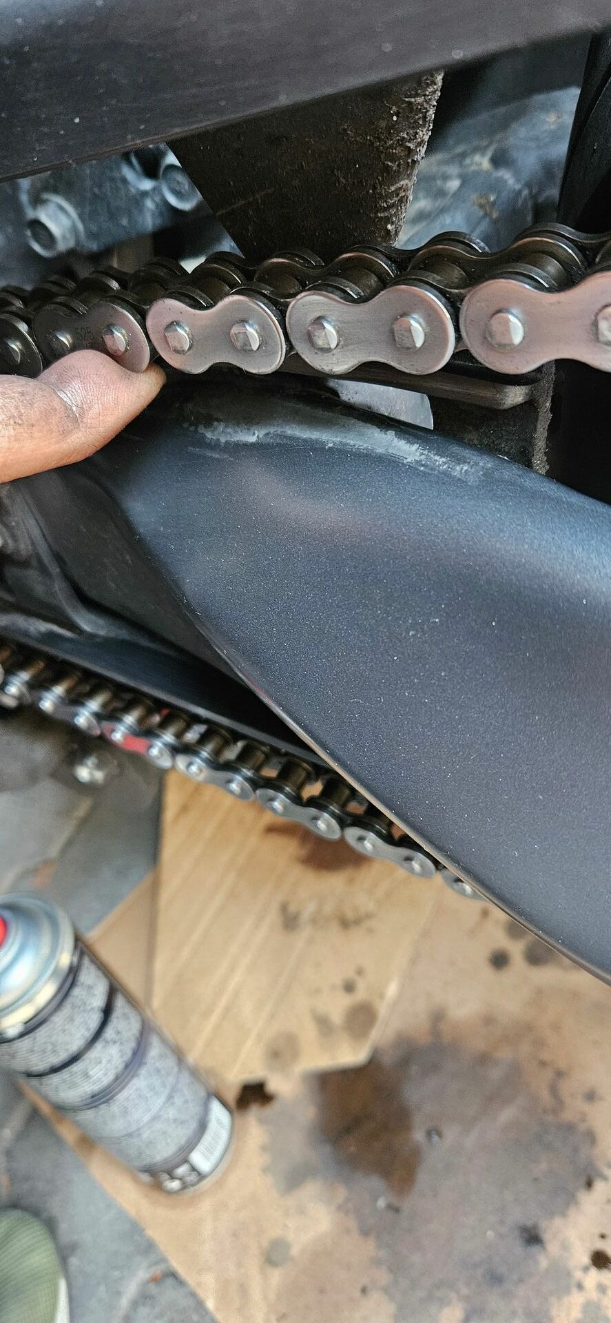 Vorhin war mal wieder Kettenreinigen angesagt, dabei stellte ich mit Schrecken fest, dass der Lack unter der Gummikettenführung.. keine Ahnung wie das richtig heißt, komplett weg ist.