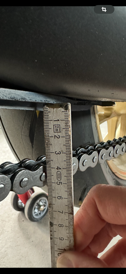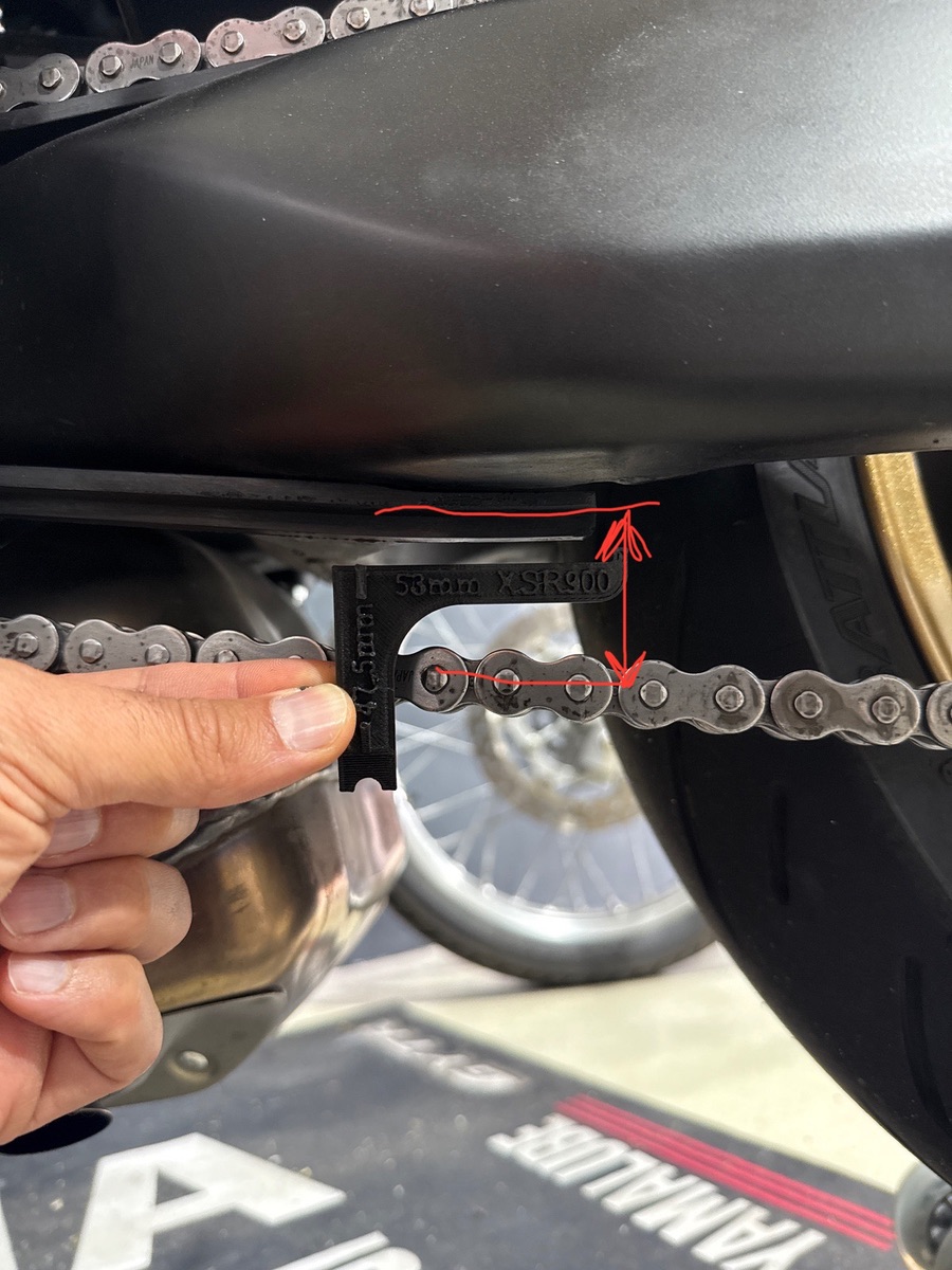 Also als ich meine XSR900 damals erhalten habe, habe ich damals bei 0km ein Bild vom Kettendurchhang gemacht. Das Maß war ca. Bei 46-47mm. Wenn ich nun das Tool anlege wie ich es für mich logisch wäre, hätte ich den Mittelwert von 47.5mm ca. Und die Kette wäre leicht herrunter gedrückt wie es Yamaha angibt.