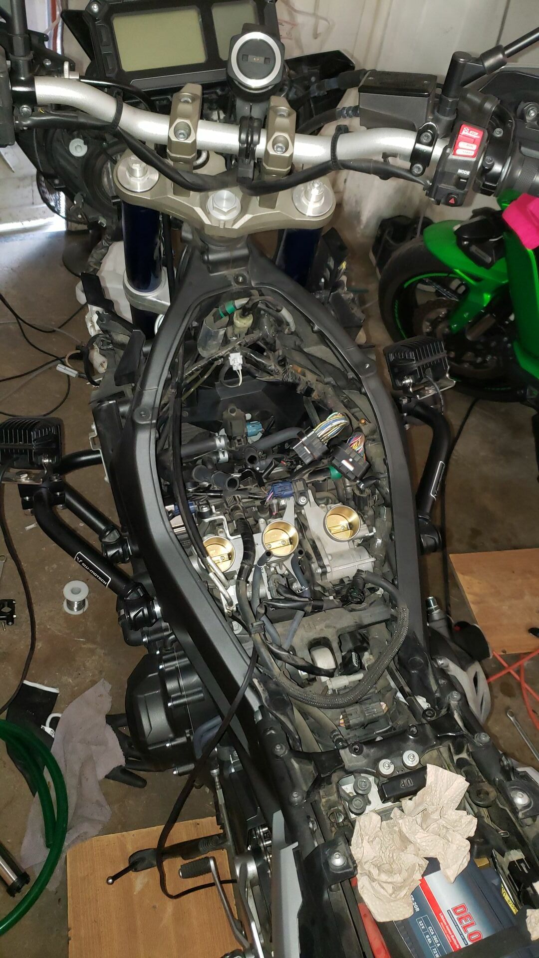 Im Vorfeld habe ich natürlich auch ein 2poliges Silikonkabel ( wegen der Hitzebeständigkeit am Motor) im Rahmen verlegt. Vom Lenker aus wo ich die Abzweige eingelötet habe bis hinter zum Startakku. 1,2m reichen da genau aus. Anschließend habe ich die 2 Schaltleitungen die von vone kommen an ein 12V Standardrelais angelötet. Dieses wiederum schaltet dann die sonst üblichen 12V+ vom Akku über eine 5A Sicherung zu den Zusatz LED Lampen durch (27W pro Stück) Das Minus der Zusatzlampen habe ich dann direkt über eine seperate Leitung am Startakku angeschlossen. Und dann funktioniert das ganze auch reibungslos, so wie ich mir das vorgestellt hatte. Einen kleinen Rückschlag gab es zwischendurch trotzdem. Ich hatte beim messen der Fernlichtspannung zuerst 27V gemessen die am Ausgang der Lichtbox anlagen. Ich dachte erst kann doch nicht ganz sein bei 12V Systemspannung. Habe mich dann aber doch durchgerungen ein 24V Relais zu bestellen. Habe das dann nach abschleißender verkabelung eingesteckt. Und als ich es probieren wollte mit laufendem Motor gingen die Zusatzlampen dann doch nicht. Lediglich das normale Serienfernlicht ging an.