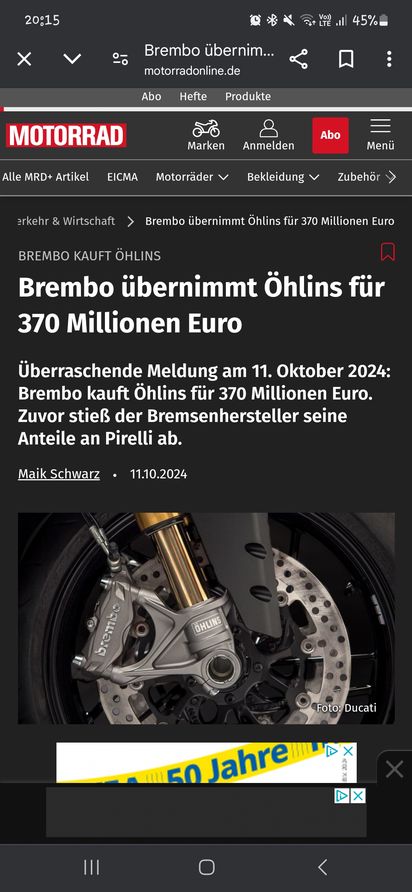 Überraschende Meldung am 11. Oktober 2024: Brembo kauft Öhlins für 370 Millionen Euro. Zuvor stieß der Bremsenhersteller seine Anteile an Pirelli ab.