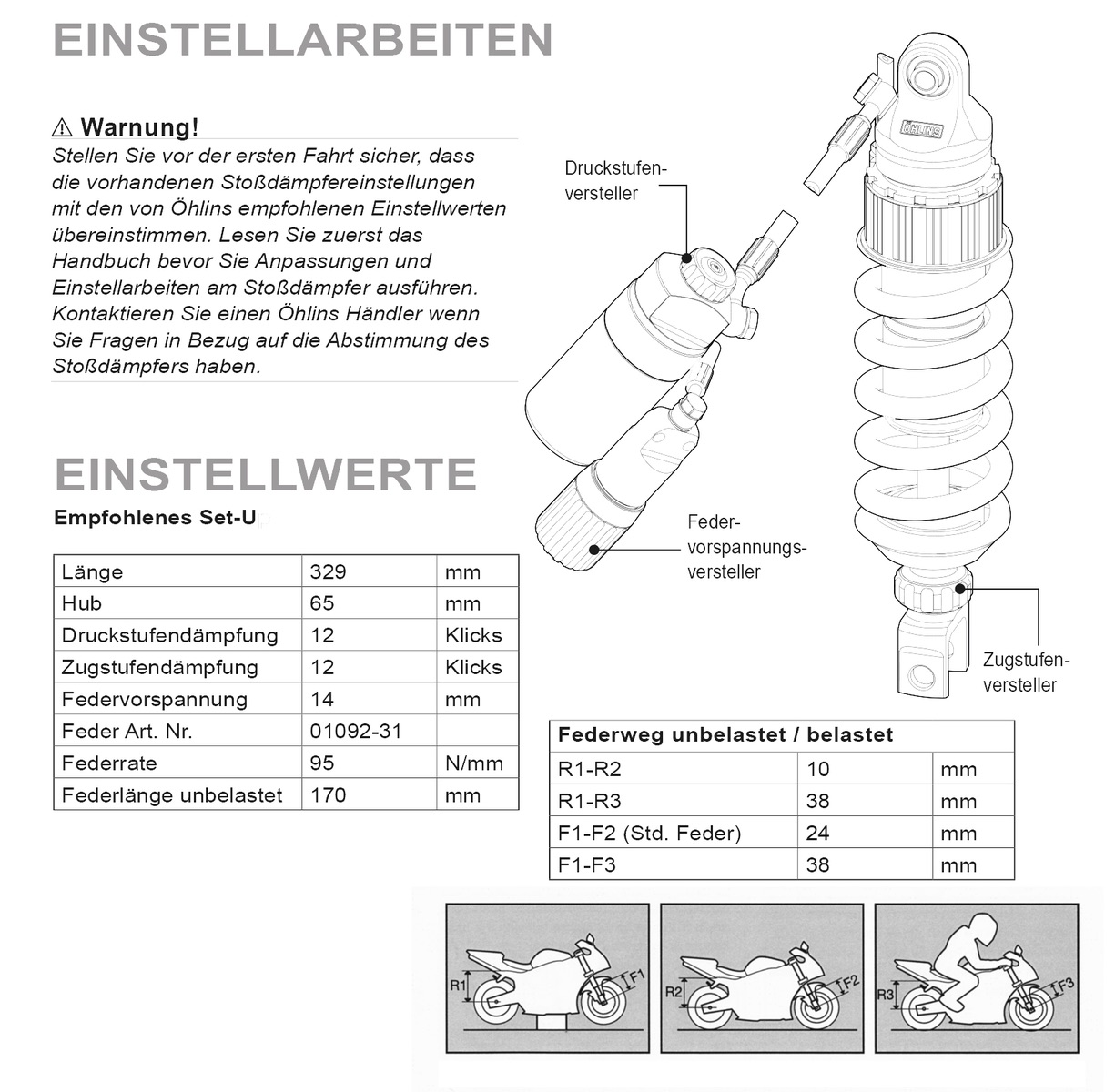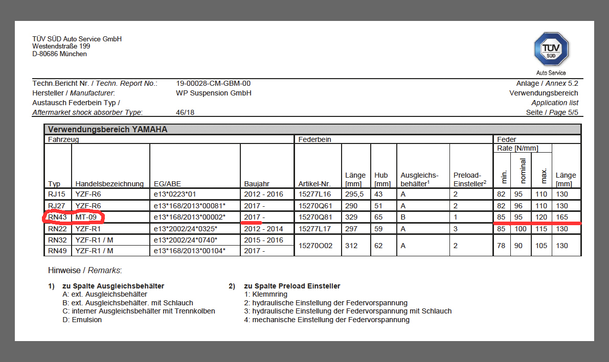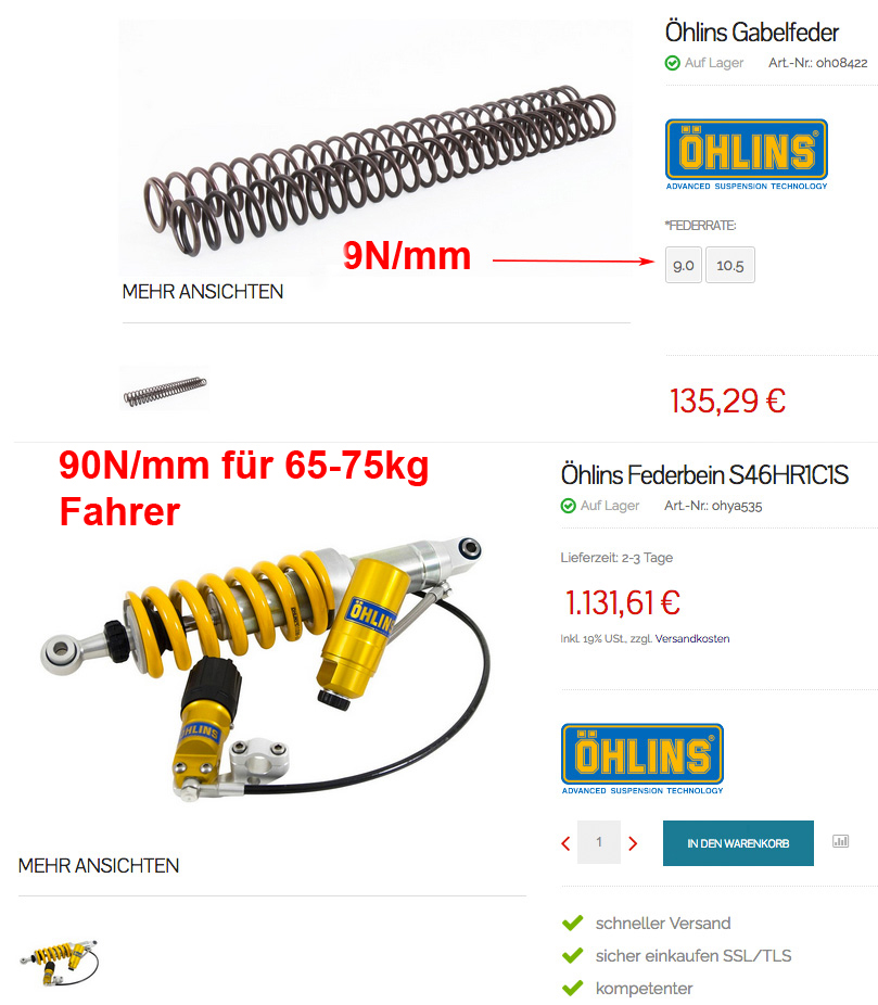 Ich spreche halt aus eigener Erfahrung. Vorne in der Gabel sind 9N/mm Öhlinsfedern drin. Hinten 90N/mm; eben angepasst ans Fahrergewicht.