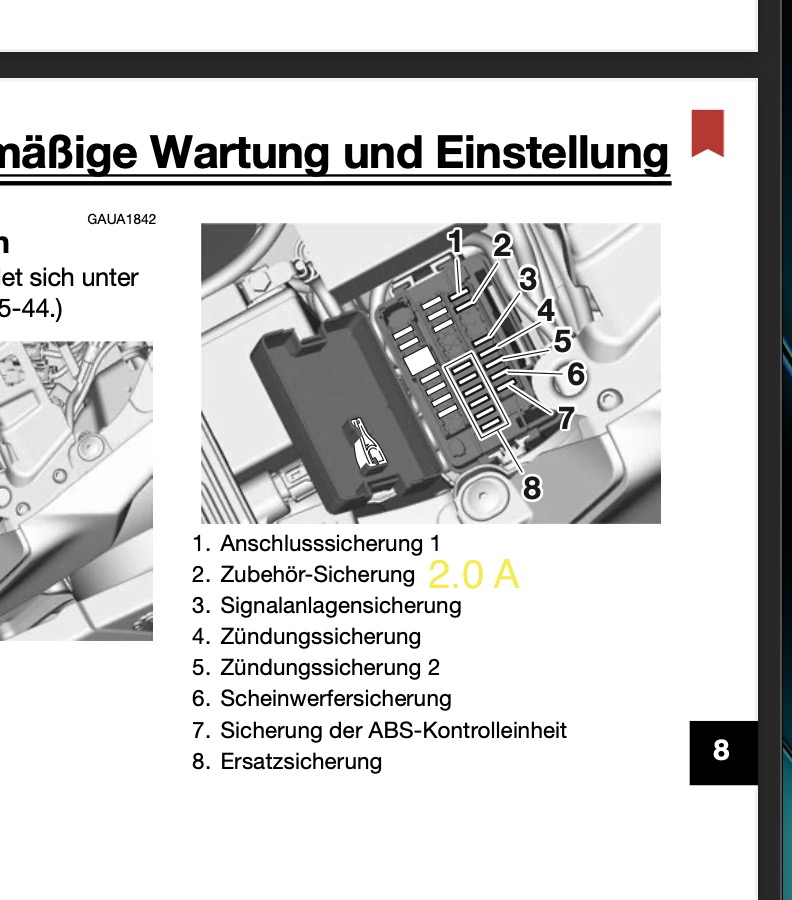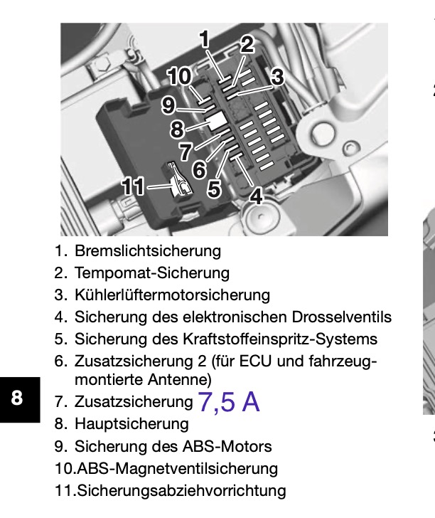 Servus, vielleicht eine von den beiden Sicherungen? Könnte mir vorstellen, die 2.0 A Zubehör für den USB-Anschluss und die 7.5 A Zusatzsicherung für die Heizgriffe.
