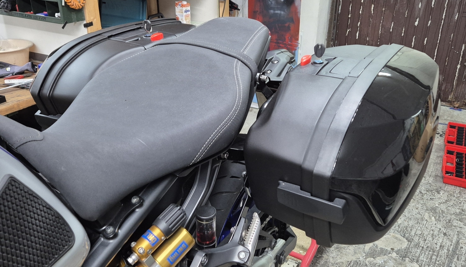Die Koffer haben ein fassungsvermögen von jeweils 37 llter, jedoch kann man das nicht voll ausnutzen. Die schöne Form hat auch ihren Nachteile. Auf längeren von Touren kommt dann noch eine kleine Tasche hinten drauf.