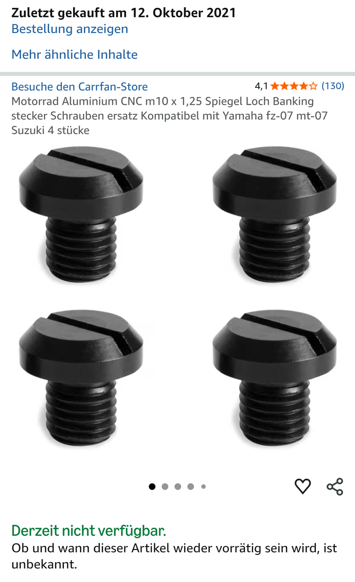 #66 Alles anzeigenNur die Gummi Stöpsel um die Löcher der Original Spiegel zu zu machen sind misst, habe beim "Kupplungshebel" den ganzen Halter sammt Spiegel abgeschraubt da ich keinen Hebel habe, wegen YAMT und beim Bremshebel habe ich ehe eine Schraube gebraucht um den Bremsflüssigkeitsbehälter wieder an zu schrauben. Da gibt es aber auch Andere Alternativen auf AliExpress, wichtig nur beachten ihr braucht was mit Re. und Li. Gewinde bei der MT 09, weil da gibt es unterschiedliche Sets.