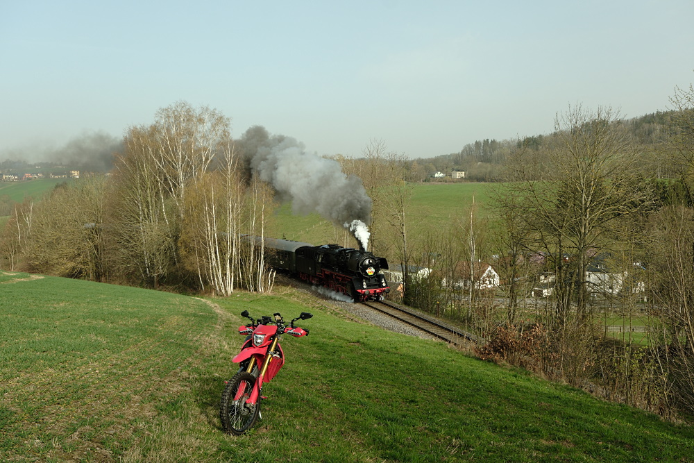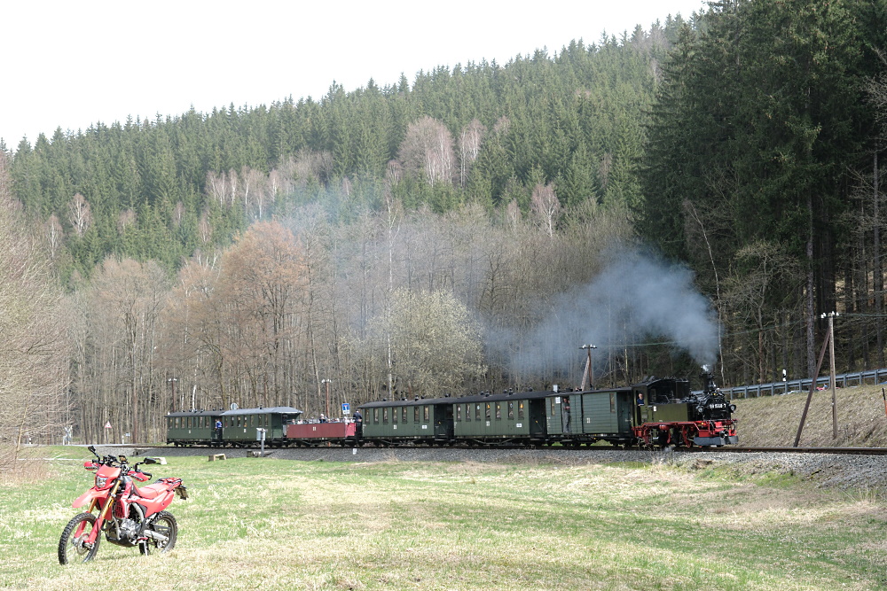 Am 31.03.2024 wurde die Waldmaus ( Honda 250 ) auch einmal bewegt, um den Osterhasenzug im Erzgebirge zu begleiten .