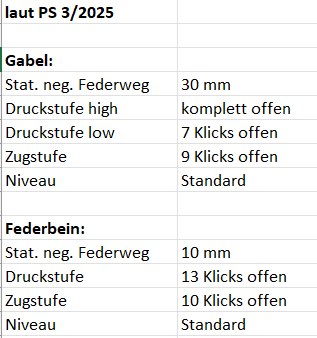 #4 Das hier hab ich der der PS abgeschrieben... ist für Fahrergewicht 80 kg (ohne Klamotten, wenn ich mich recht erinnere)