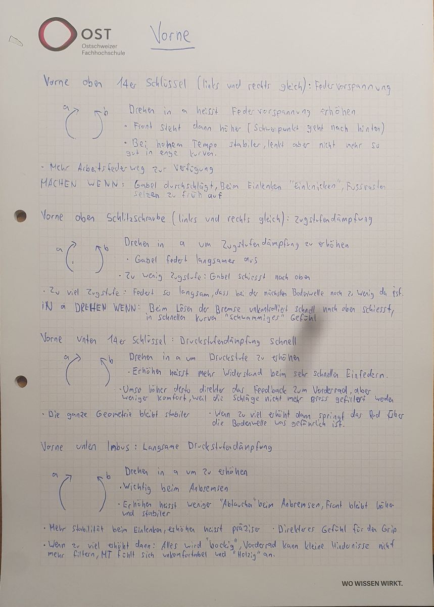 - Ich musste feststellen das ab Werk an der VA die Federvorspannung, an beiden Holmen, nicht gleich eingestellt war. Genauso wie die schnelle Druckstufe, also da lohnt es sich schon das mal selbst zu kontrollieren und zuerst alles auf die Standardwerte einzustellen, damit man eine gute Basis hat, bevor ihr euch ans Rumprobieren macht