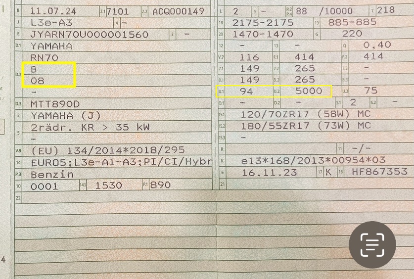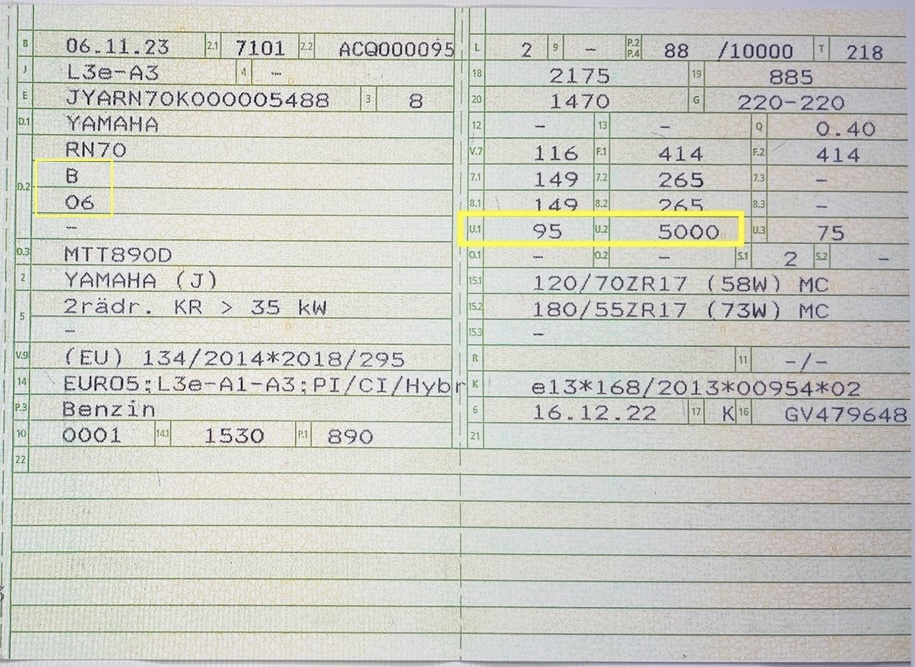 Yamaha hatte, aus welchem Grund auch immer, mitten in der RN70-Serie Veränderung vorgenommen, wie zum Beispiel eine Standgeräusch-Herabsetzung (2021-2023 = 95db(A), 2024 = 94db(A)), was natürlich auch zu einer neuen Version führte (siehe Fahrzeugschein Feld „D.2“ bzw. Fotos). Das kommt vermutlich ständig und in den besten "Modellfamilien" vor; birgt aber gewisse Risiken.