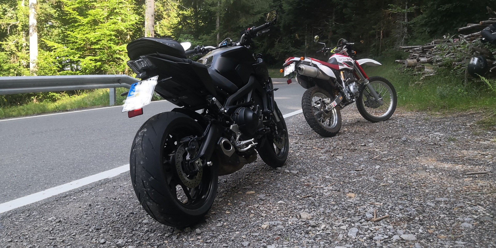 Bin heute wieder Kleine runde gefahren mit mein kumpale , ca 300 km ,Und meine S21 haben genau 3500 km gehalten Hinten so wie ihr sieht ist sie fertig und vorne ging noch locker noch 1500 km noch, kein Autobahn ,Nur Bergstrasse, jetzt hab ich Mitas sportforce + drauf Werde morgen runde fahren und vergleichen,