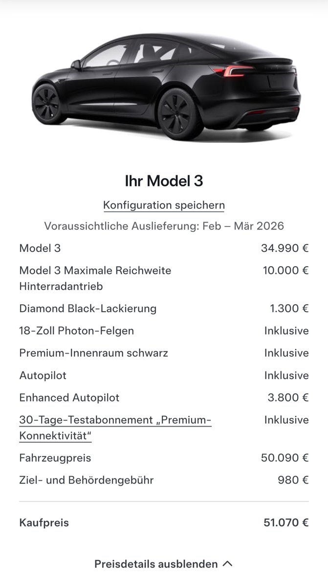 Naja, ich habe spaßeshalber gerade einen Tesla 3 konfiguriert.