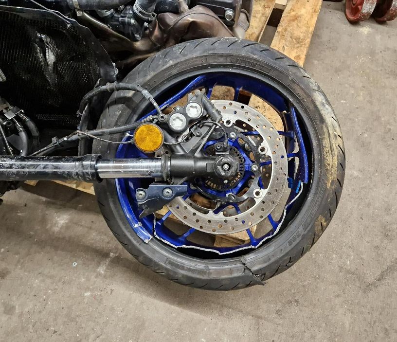 Reifen vorne zerstört, Kühler defekt, Auspuff geknickt, Tank defekt.