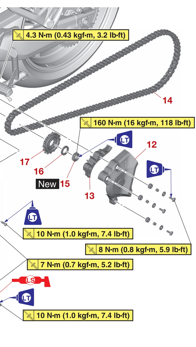 #4 Alles anzeigenWenn ich das im Manual richtig lese, muss das voedere Ritzel bei meiner Tracer mit 160 NM angezogen werden. Das kann ich kaum glauben. Habt ihr andere Erkentnisse?