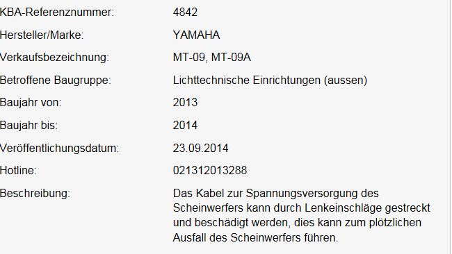 RÜCKRUFAKTION : MT09 Scheinwerferprobleme