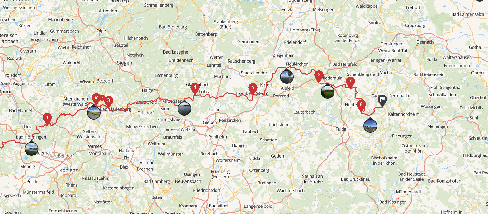 die erste mehrtägige (3Tage) Tour des Jahres......von Aachen aus gen Osten . Insgesamt 1475 Km nur Landstrasse....erst durch die Eifel bis Bad Breisig am Rhein, mit der Fähre rüber und dann bis zur Grenze Hessen / Thüringen. Zum Glück spielte das Wetter mit....in der Eifel bis zum Rursee wars noch stellenweise nass.....ab da war es trocken.