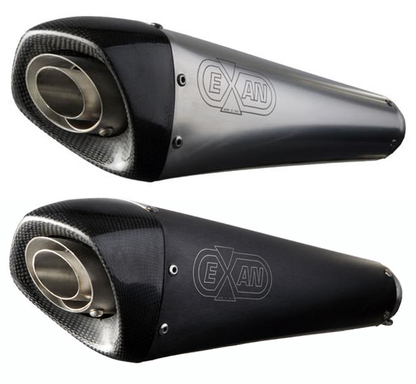 Vom ital. Hersteller EXAN gibt es nun auch ein paar Varianten von ESDs kombiniert als Komplettanlage mit eigenem Krümmersystem (sind sehr schöne Endtöpfe, wie aber auf der Herstellerseite selbst nur schwer zu erkennen ist)… Er ist auch besser unter der MT integriert und steht auch nicht so weit heraus, wie manch andere ESDs. Gibt es in 3 Ausführungen mit normaler Mantellänge – Edelstahl, Titan und Schwarz in Verbindung mit Carbon-Endkappe; sowie 2 weitere Ausführungen mit kürzerer Mantellänge in Edelstahl und Schwarz mit silberner Endkappe: