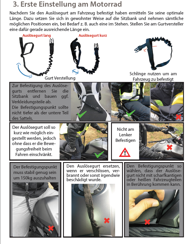 Die Reißleine sollte immer zwischen Sitz und Tank herauskommen. So ist gewährleistet, dass die Entfernung zum Auslösemechanismus möglichst gering ist. Die Reißleine darf NICHT am Lenker befestigt werden!
