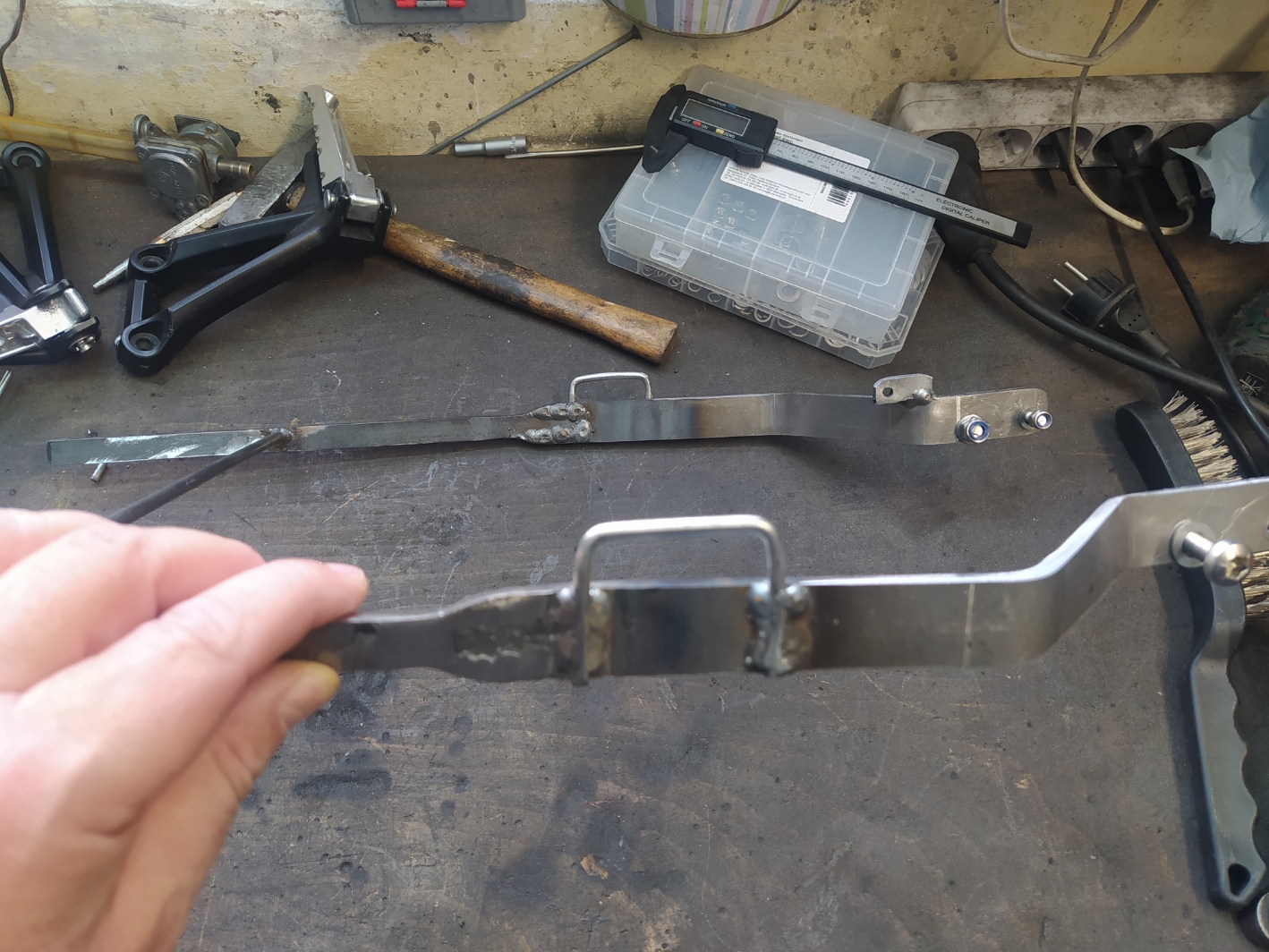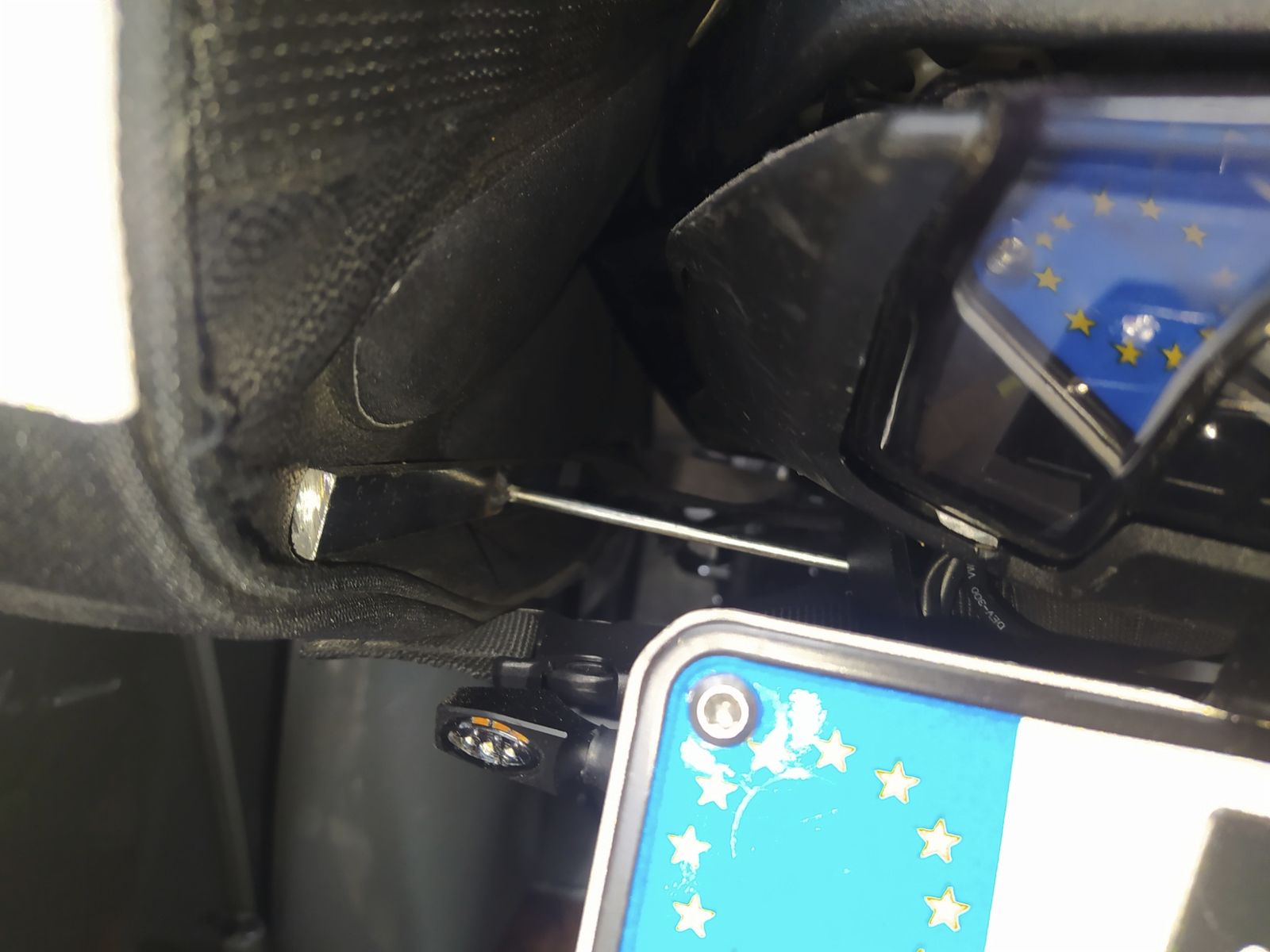 Erwartungsgemäß saßen die Taschen, da sich der Sattel nach hinten verjüngt und ich auch nicht über eine entspechende Satteltaschen-Halterung verfüge, hinten auf den Blinkern (kurzer Kzh) auf und waren auch Richtung Hinterrad nicht gesichert (konnten unter den Sattel schwingen). Da ich mir auch keine teure Lösung kaufen wollte, kam nur was selbstgebautes in Frage. Als Befestigungspunkt habe ich die Halter der hinteren Fußrasten auserkoren.