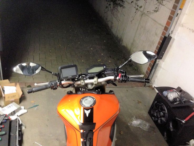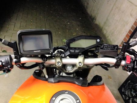 ABER: Nachdem die Originale Halterung samt meinem TomTom nicht mit dem Tankrucksack harmoniert hat, hab ichs wieder runter gebaut. Die Position sonst (also ohne Tankrucksack) ist ansonsten sehr gut auf den Klemmblöcken.