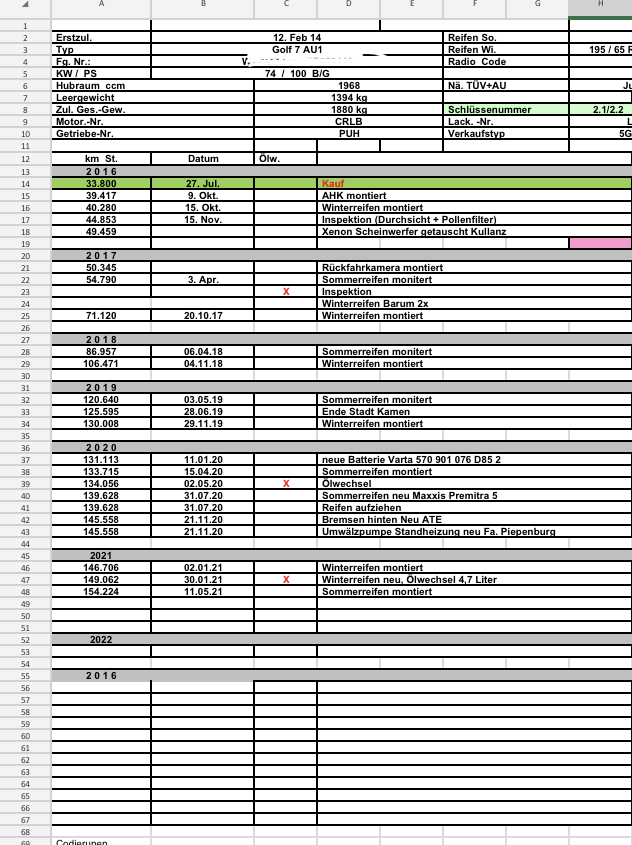 #74 Alles anzeigenIch habe mich jetzt auch dafür entschieden die Jahresdurchsicht selber zu machen, obwohl noch ein Jahr Garantie. 1.000er habe ich ja noch machen lassen. Aber die die ca. 300€ im Ruhrgebiet sind mir doch zu heftig für Ölwechsel und Schrauben nachziehen. Ja ich weiß, einigen denken: wer sich ein Motorrad leisten kann….. aber ich sehe die Preise als übertrieben. Daher lasse ich es nicht machen. Bei meinem Auto mache ich auch alles selber. Habe über Jahre dann eine Excel Tabelle angelegt was immer so an dem Auto (erst Golf 4 dann Golf 7) von mir gemacht wurde. Und so werde ich es auch bei der Yamaha handhaben.